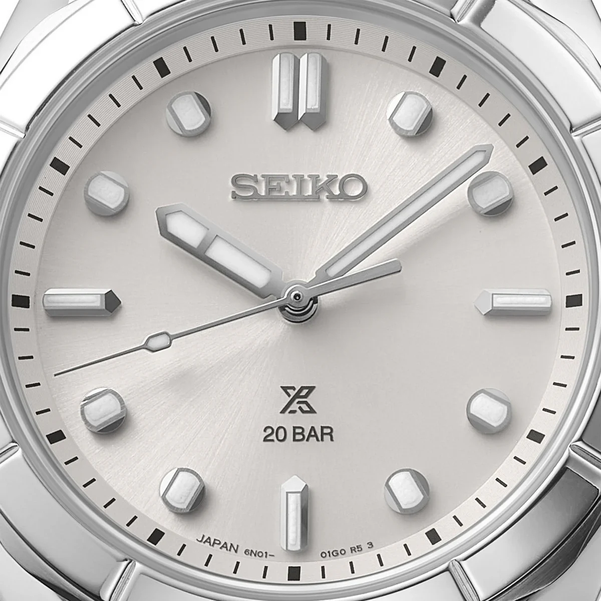 Koperta o średnicy 34 mm i grubości 8,9 mm wykonana została z odpornej na korozję stali szlachetnej. Srebrna tarcza zachwyca szlifem słonecznym – jest to rodzaj wykończenia, w którym powierzchnia tarczy odbija światło promieniście niczym słońce, tworząc efekt subtelnego rozbłysku przy każdym ruchu nadgarstka. Punktowe indeksy oraz prostokątne znaczniki godzin 6 i 12 nadają kompozycji symetrii i lekkości, a nakładane logo SEIKO oraz znak kolekcji Prospex podkreślają jej profesjonalny charakter.