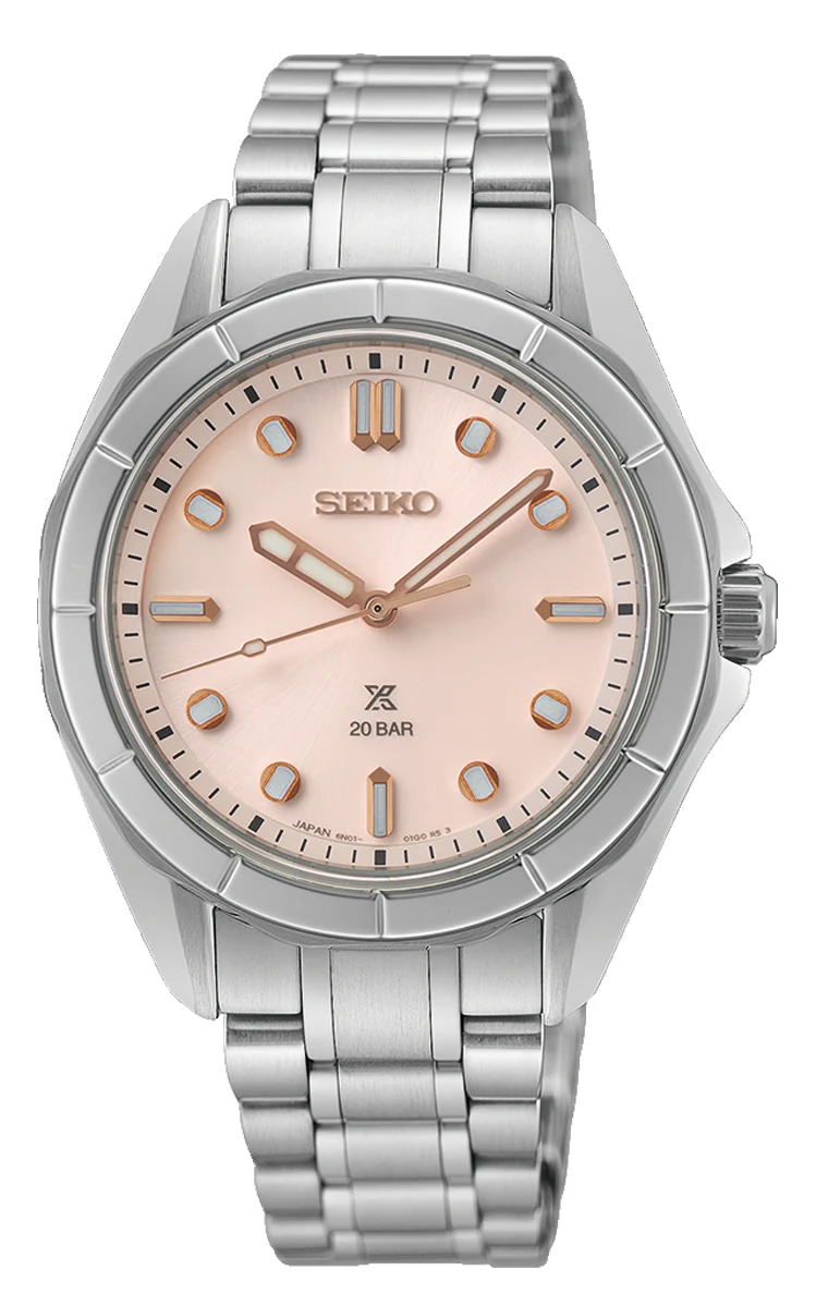 Seiko Prospex Sea Ladies damski zegarek z różową tarczą o szlifie słonecznym, szkłem szafirowym i wodoszczelnością 20 bar. Styl, siła i elegancja w jednym.
