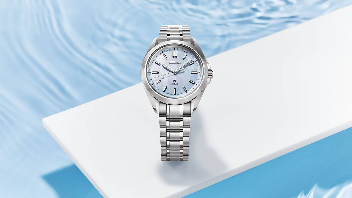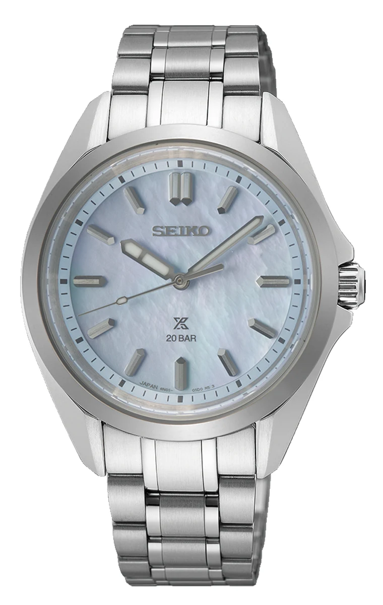 Jego wyjątkowa tarcza z masy perłowej mieni się delikatnym błękitnym odcieniem, który subtelnie zmienia ton w zależności od kąta padania światła. Efekt naturalnej perły sprawia, że każdy egzemplarz jest niepowtarzalny, a chłodne refleksy błękitu przywodzą na myśl powierzchnię spokojnego morza. Geometryczne, fazowane indeksy oraz wskazówki z powłoką LumiBrite zapewniają doskonałą widoczność i elegancki, techniczny charakter. Na tarczy znalazły się klasyczne logotypy SEIKO i Prospex – symbole jakości i profesjonalizmu marki.