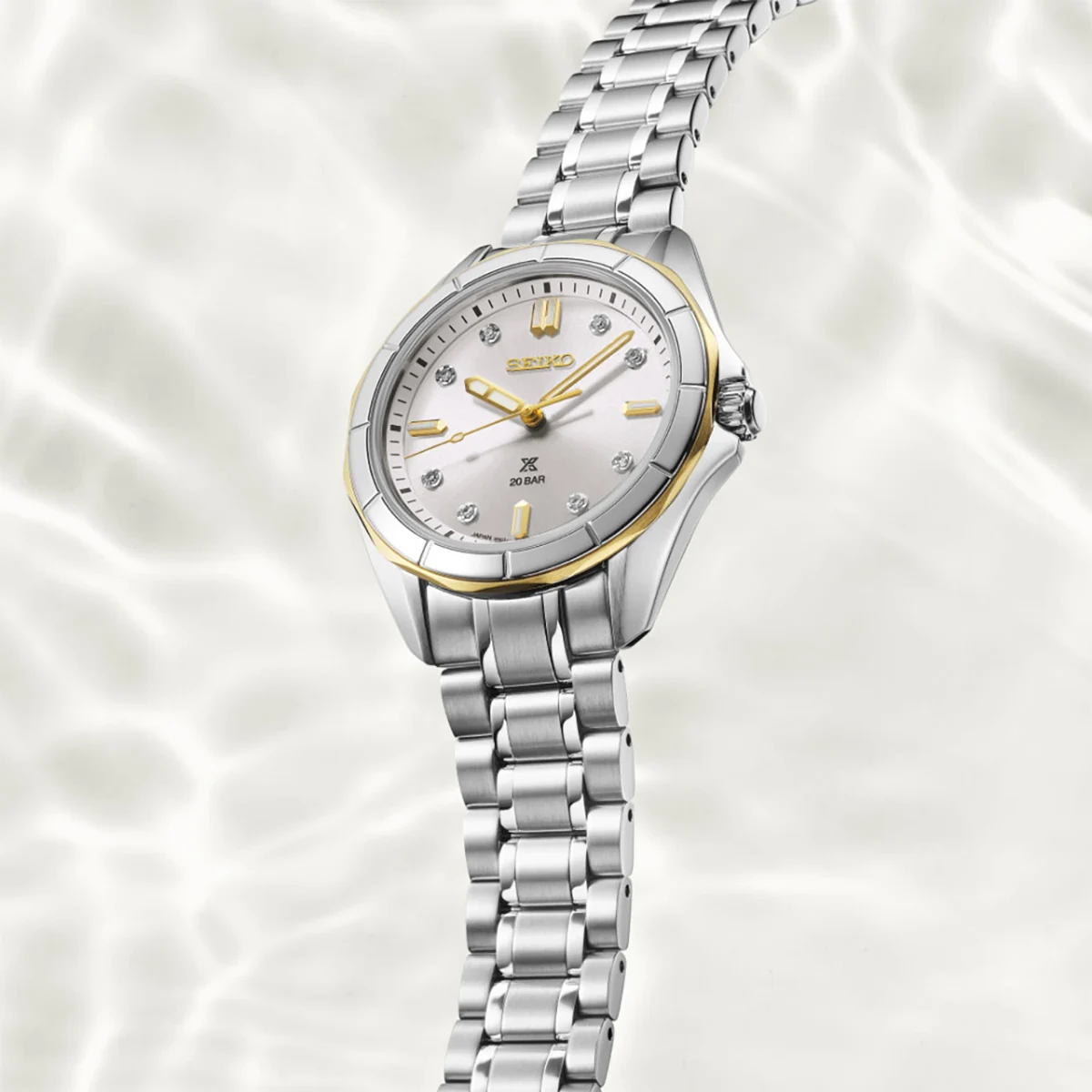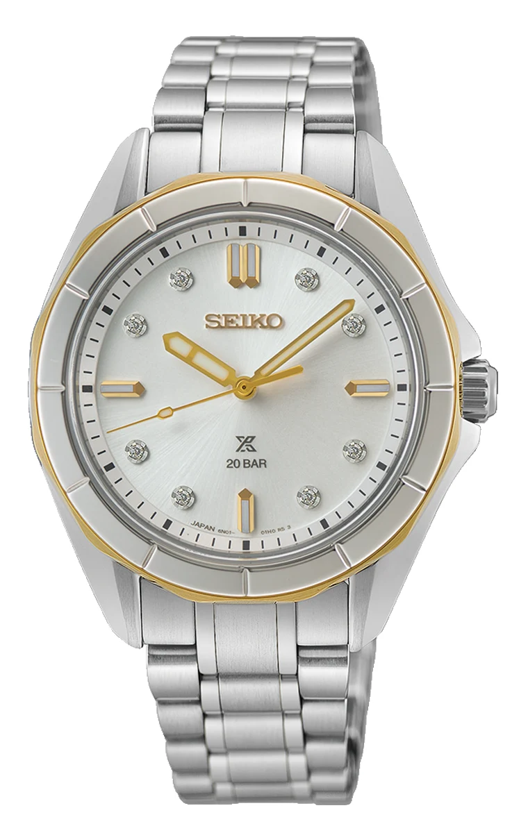 Seiko Prospex Sea Ladies SUR618J1 elegancki zegarek damski z diamentami i srebrną tarczą o szlifie słonecznym. Wodoszczelność 20 bar, szkło szafirowe i złote detale.