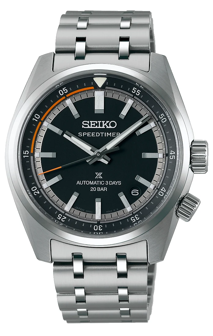 Seiko Prospex Speedtimer Automatic SPB515J1 to sportowy zegarek w duchu klasycznych „timerów” rajdowych, zaprojektowany do precyzyjnego odmierzania krótkich odcinków czasu. Czarna tarcza z delikatną fakturą nadaje mu narzędziowy charakter, a pomarańczowy akcent na skali minutowej podkreśla dynamikę linii Speedtimer.