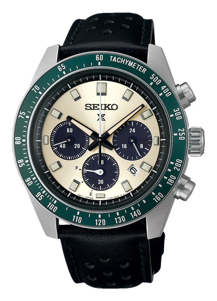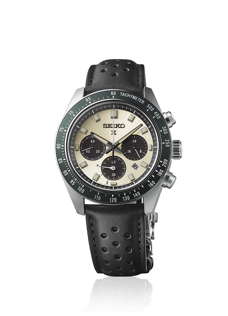 Ten chronograf, zamknięty w eleganckiej stalowej kopercie rozmiarze 41.40 mm z ciemnozieloną, aluminiową lunetą i chroniony szafirowym szkłem, wyróżnia się wyrafinowaną szampańską tarczą. Godzinowa i minutowa wskazówka nawiązuje do klasycznego modelu Speedtimer z 1969 roku, nadając mu ponadczasowy charakter. Dzięki 12 punktom Lumibrite zegarek zapewnia doskonałą czytelność nawet w słabym oświetleniu. Dodatkowo wyposażono go w liczniki chronografu oraz tachymetr na lunecie, co pozwala na precyzyjny pomiar czasu i prędkości – znak rozpoznawczy oryginalnego Seiko Speedtimer. Na szampańskiej tarczy znalazła się również subtarcza czasu dobowego 12/24h.