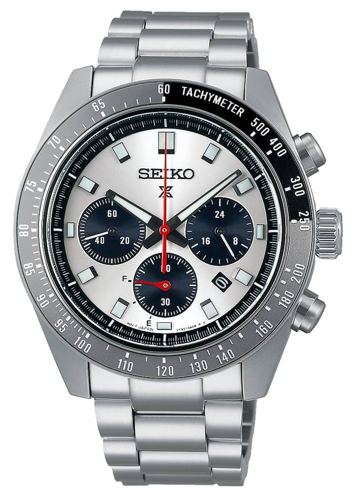 Pod zakrzywionym transparentnym szkłem szafirowym wysoce odpornym na zarysowania znajduje się biała tarcza. Aktualną godzinę wskazują wskazówki i indeksy ze świecącą w nocy powłoką LumiBrite. Zegarek Seiko Prospex Speedtimer wyposażony został w sportowy chronograf inaczej nazywany stoperem. Chronograf pomoże odmierzyć dokładny czas na przykład w czasie wyścigu. Specjalne subtarcze pomogą zmierzyć czas z dokładnością do 1 godziny. Na godzinie trzeciej pojawiła się subtarcza pory dnia. Wskazuje ona czas dobowy 12/24h. Między godziną czwartą i piątą producent umieścił okienko datownika z aktualnym dniem miesiąca. Pod tarczą umieszczony został wyjątkowy mechanizm solarny. Pracę zegarka napędza system, który swoją moc pobiera z różnego rodzaju źródła światła. Specjalne panele słoneczne umieszczone pod tarczą pobierają energię ze światła i przetwarza ją w energię elektryczną. Ważnym elementem pracy systemu solarnego jest magazynowanie energii w baterii, co zapewnia dłuższą pracę zegarka. Specjalna skala umieszczona zaraz przy subtarczy na godzinie szóstej informuje o poziomie naładowania baterii.