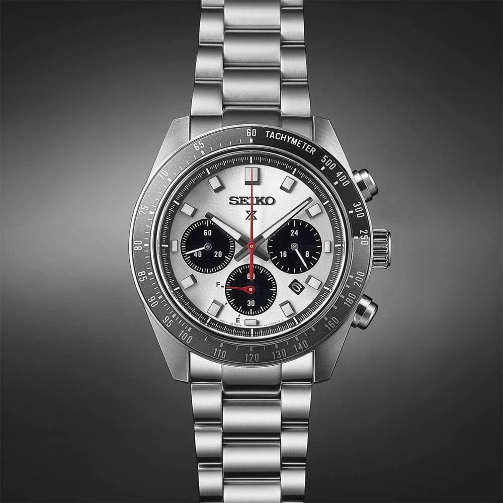 Męski zegarek Seiko Prospex Speedtimer SSC911P1 to reprezentant profesjonalnego dziedzictwa marki Seiko. Po aktualizacji projektu Seiko postanowiło pójść w stronę większych kopert i tak powstało hasło "Go large". Zegarek zamknięty został w 41.40-milimetrowej kopercie wykonanej ze stali szlachetnej klasy 316L. Koperta uszczelniona została do 100 metrów, co pozwala na pływanie z zegarkiem na nadgarstku bez obawy o jego uszkodzenie. Na froncie zegarka znalazł się aluminiowy bezel ze skalą tachymetru. Tachymetr to pierścień ze skalą będącą funkcją, która umożliwia wykonanie pomiaru średniej prędkości przebytej na dystansie 1 km (wyrażany w km/h). Po prawej stronie zegarka znalazła się duża i wygodna w obsłudze koronka oraz przyciski funkcyjne. Czasomierz zestawiony został z bransoletą stalową. Posiada ona bezpieczne i komfortowe zapięcie motylkowe.