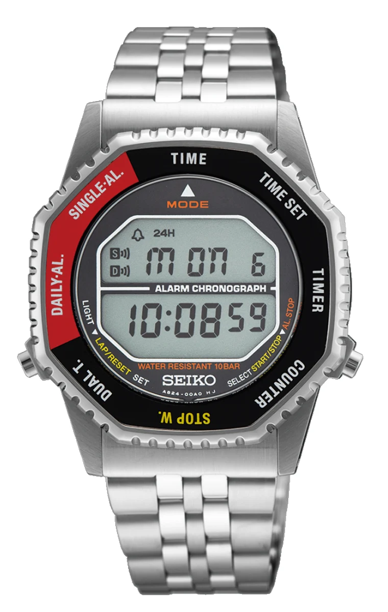 Seiko Rotocall SMGG19P1 – cyfrowy zegarek z obrotowym pierścieniem i czerwonymi akcentami. Reedycja modelu z 1982 r., stal 316L, 100 m, retro design.