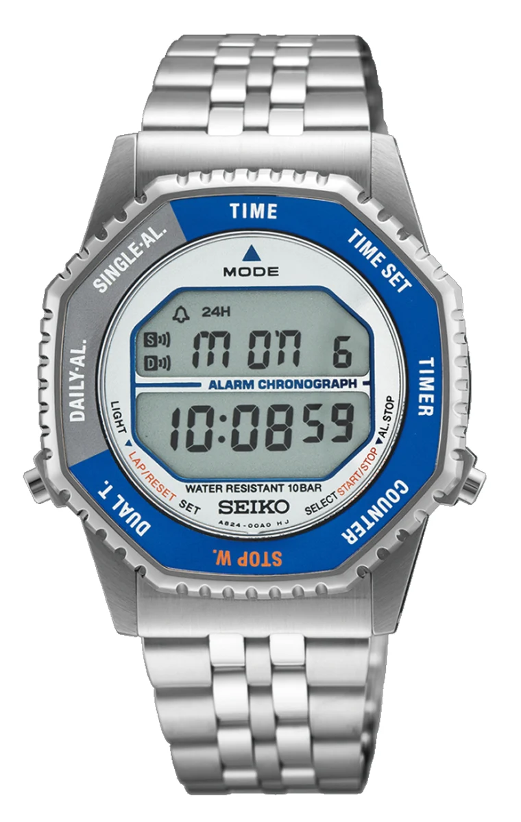 Seiko Rotocall SMGG21P1 – cyfrowy zegarek z niebieskim pierścieniem, stalową kopertą i bransoletą. Reedycja modelu z 1982 roku, 100 m wodoszczelności.