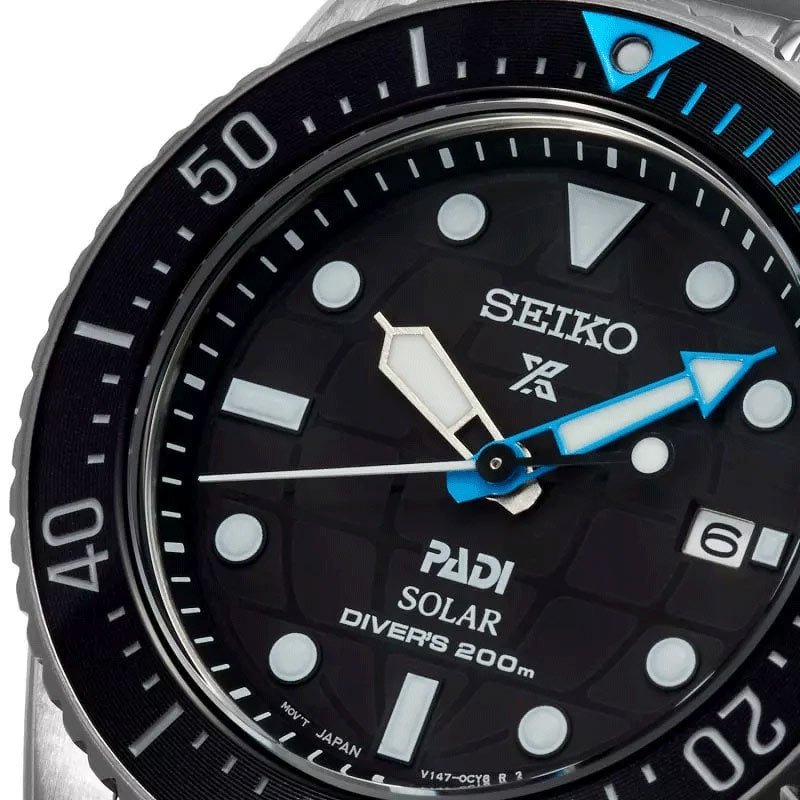 Nurkowy zegarek Seiko Scuba Diver jest wyposażony w kaliber V147, który zasila urządzenie, przetwarzając na energię światło zarówno ze źródła naturalnego, jak i sztucznego. Jego tarczę charakteryzuje wzór siatki kartograficznej Ziemi taki jak w logo PADI oraz tematyczne, jasnoniebieskie akcenty kontynuowane na jednokierunkowo obrotowej lunecie z podziałką 60-minutową. Za jej zabezpieczenie służy wysoce odporne na zarysowania szkło szafirowe. Zastosowanie substancji LumiBrite na indeksach, wskazówkach i oznaczeniach na ramce, konkretnych kolorów oraz dużych i przejrzystych kształtów, ma zapewniać wysoką czytelność. Nawet na dużych głębokościach.