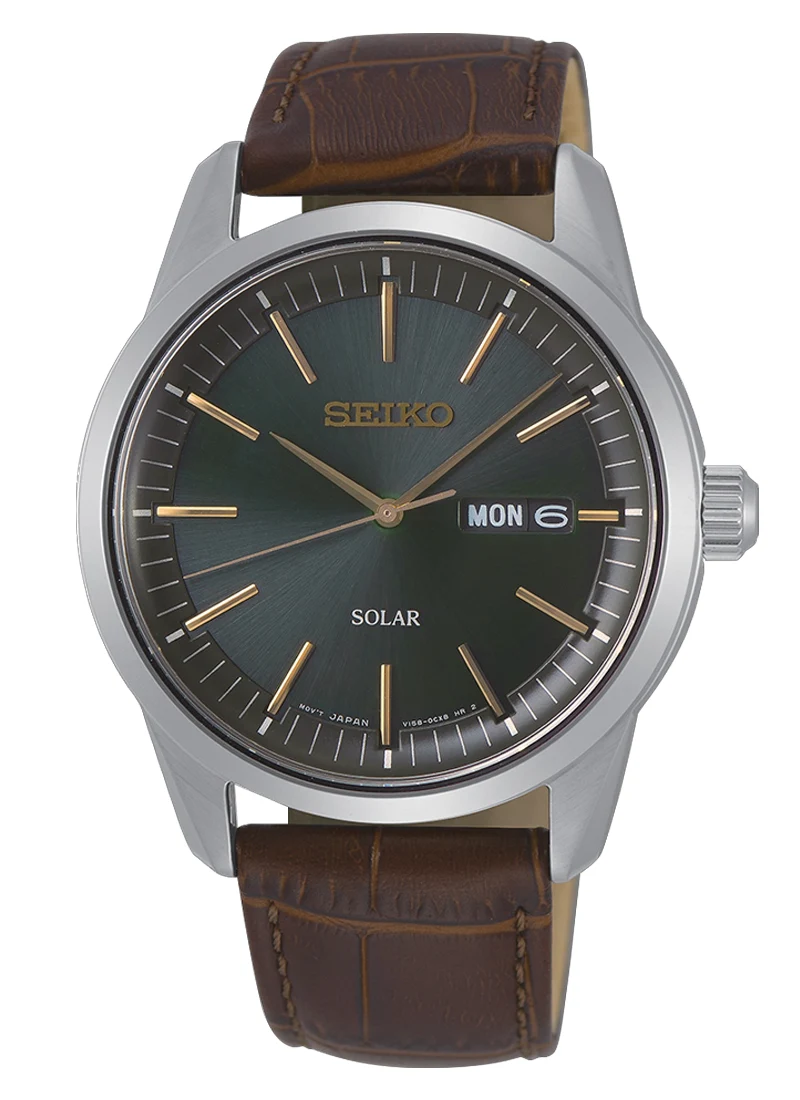 Seiko Solar SNE529P1 to elegancki męski zegarek solarny z zieloną tarczą, złoconymi detalami i szafirowym szkłem, wyposażony w datownik i skórzany pasek.