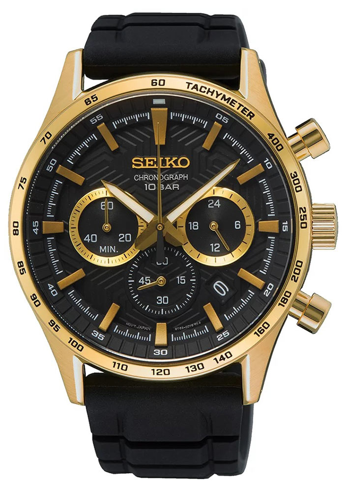 Pozłacany zegarek męski Seiko na pasku gumowym. Japoński mechanizm z chronografem. Czarna tarcza przykryta twardym szkłem szafirowym. Bezel ze skalą tachymetru