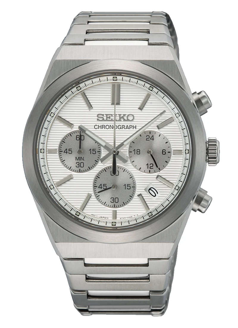 Seiko Sport Chronograph SSB451P1 to propozycja dla mężczyzn, którzy oczekują połączenia sportowej funkcjonalności z ponadczasową elegancją. Model wyróżnia się jasną, białą tarczą o poziomym wzorem, na której srebrne subtarcze tworzą spójną i klasyczną estetykę — idealną zarówno do codziennego stylu, jak i bardziej formalnych zestawień.