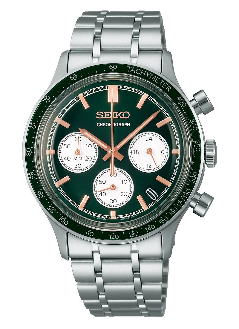 Zegarek męski Seiko SSB481P1 na bransolecie wyróżnia się elegancką zieloną tarczą, na której znajdują się trzy kontrastowe subtarcze, dwie chronografu i wskaźnik czasu dobowego 12/24h na godzinie trzeciej. Skala tachymetru umieszczona na czarnym pierścieniu wskazuje prędkość poruszania się w odległości 1 km. Wskaźnik daty dyskretnie wkomponowano przy godzinie czwartej, a całości dopełniają precyzyjne wskazówki i indeksy pokryte warstwą luminescencyjną. Za działanie odpowiada kwarcowy mechanizm japoński Seiko – niezawodny i oszczędny, idealny do codziennego użytkowania. To zegarek z chronografem stworzony z myślą o mężczyznach, którzy oczekują jakości i stylu w sportowej, lecz eleganckiej formie.