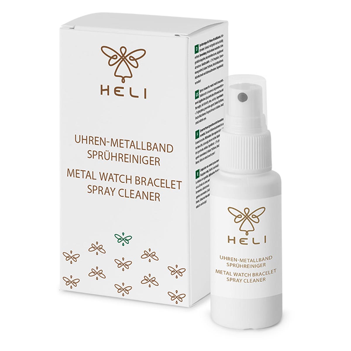 Spray do czyszczenia metalowych bransolet przy zegarkach Heli 113047. Wystarczy spryskać bransoletę, odczekać parę minut i opłukać ją w letniej wodzie. Spray Heli zapewni czystość i przyjemny zapach. Dzięki specjalnej formule uporczywe zabrudzenia zostają rozluźnione i trwale usunięte. Bez składników podlegających deklaracji zgodnie z rozporządzeniem w sprawie detergentów UE. Skład ulegający biodegradacji.