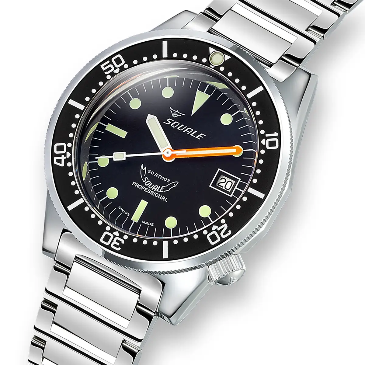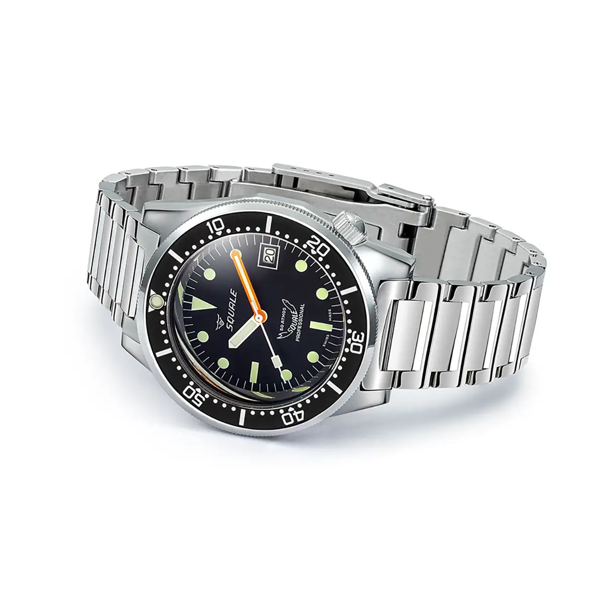 Matowa czarna tarcza jest czytelna i wyważona, z zachowaniem charakterystycznych detali marki Squale. Indeksy oraz wskazówki pokryto masą luminescencyjną Super-LumiNova®, która zapewnia wyjątkową czytelność w ciemności, nawet w głębinach. Elementy są malowane, co podkreśla surową, narzędziową estetykę modelu. Zegarek posiada także funkcjonalne okno datownika na godzinie 3 oraz pomarańczową wskazówkę minutową, ułatwiającą kontrolę czasu nurkowania.