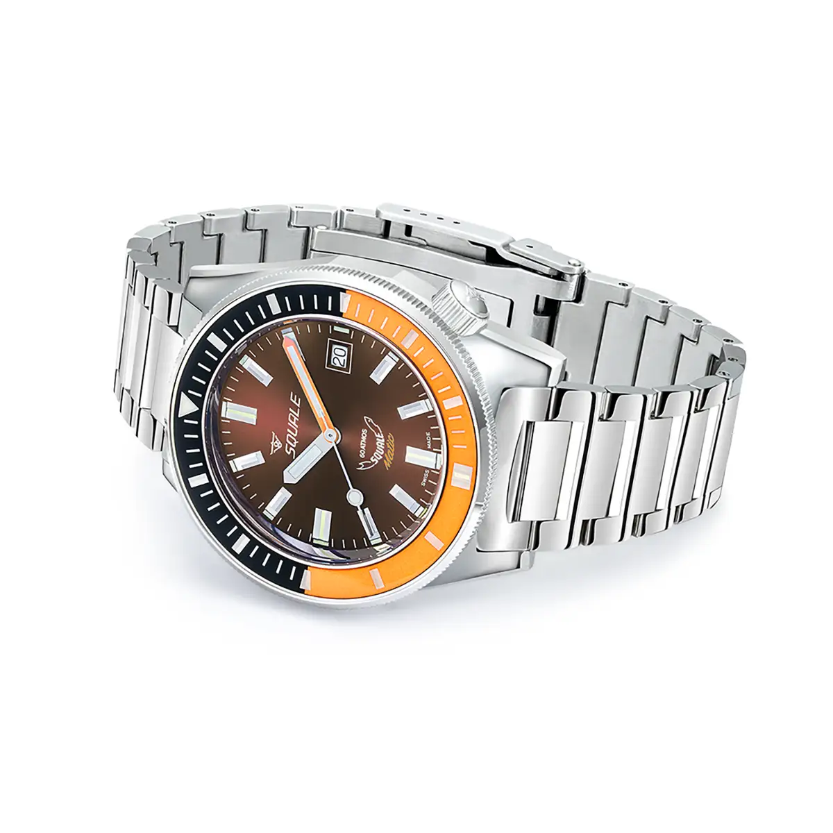 Zegarek Squale Matic MATICXSD.SQ22L to profesjonalny diver dla wymagających nurków i miłośników precyzyjnego wzornictwa. Czekoladowo-brązowa tarcza sunray, z głębią wykwintnych promieni świetlnych, w zestawieniu z dwukolorowym pierścieniem – czarnym i pomarańczowym – nie tylko przyciąga wzrok, ale podnosi funkcjonalność zegarka. Ten model oferuje imponujące wodoszczelność do 600 m (60 ATM), gwarantując bezpieczeństwo podczas głębokich wypraw.