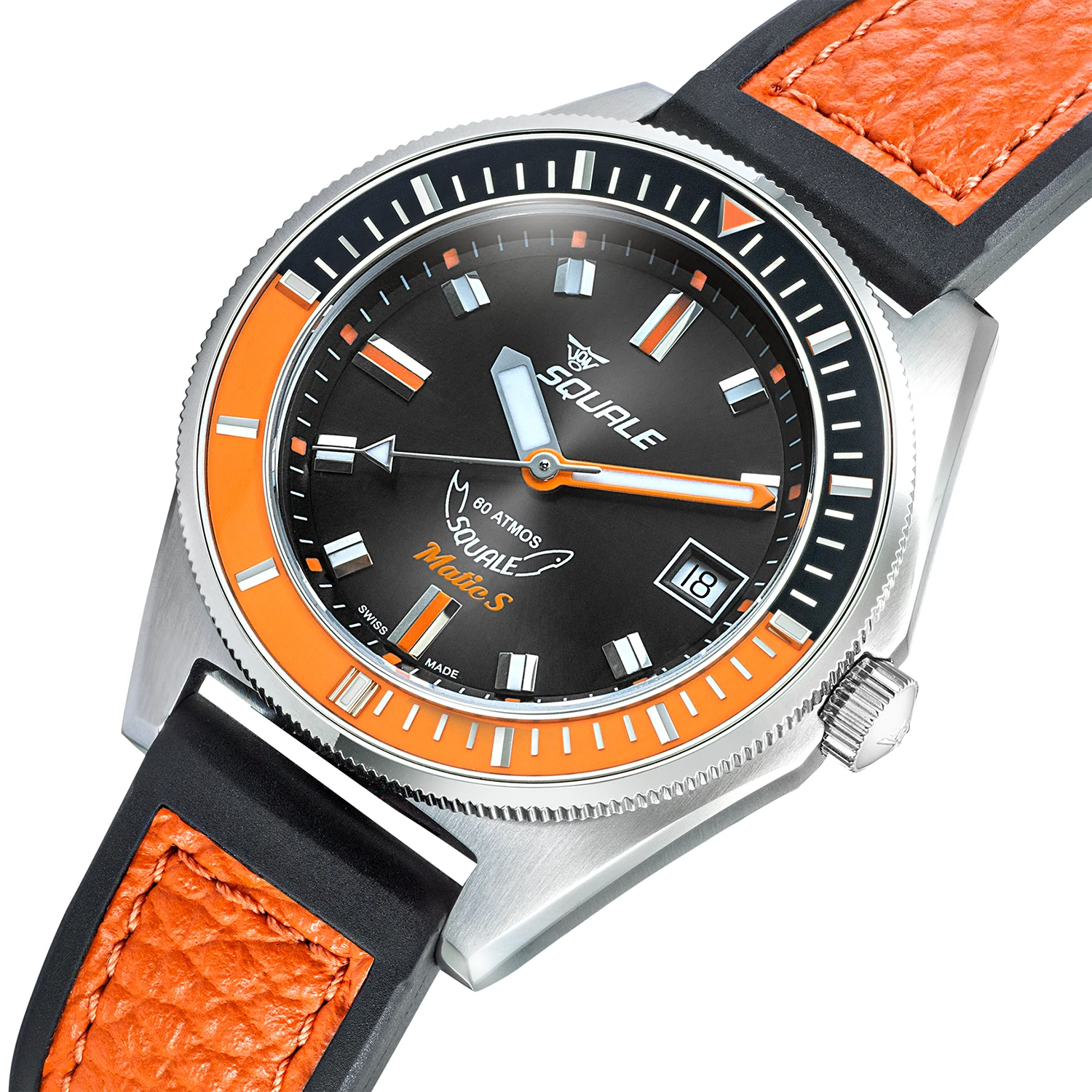 Squale Matic S Orange HydroLeather to zegarek dla mężczyzn, którzy szukają wyjątkowego połączenia ekspresji, historii i funkcjonalności. Wyróżnia się wśród diverów nie tylko kolorem, ale też dopracowanym designem i niezawodną szwajcarską konstrukcją. Stworzony, by przyciągać wzrok i sprostać każdej głębokości.