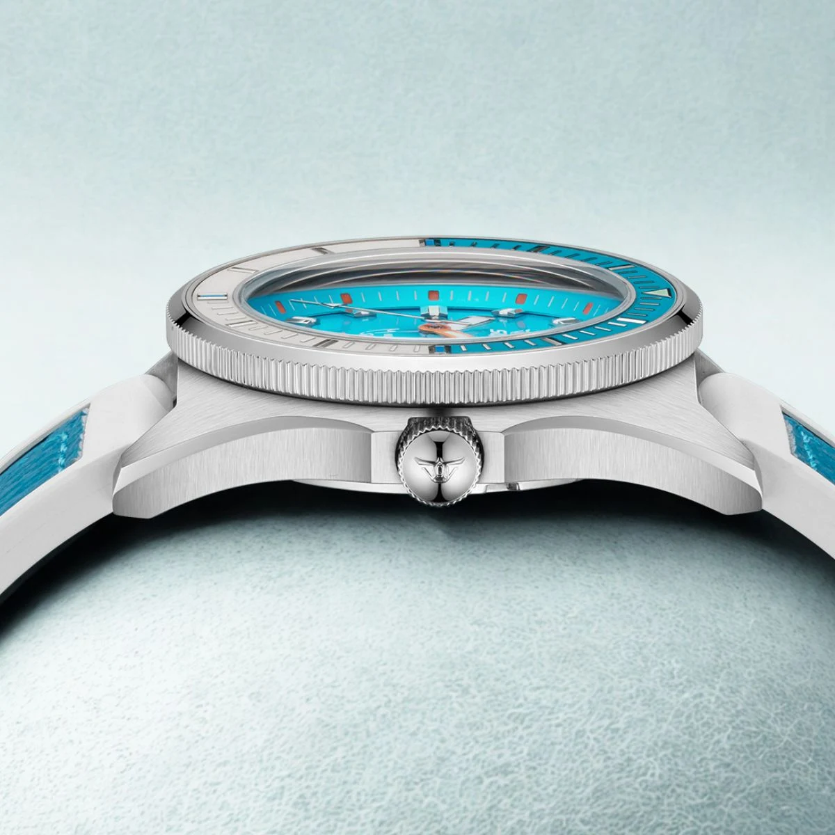 Koperta ze stali szlachetnej została przeprojektowana dla lepszego balansu i dopasowania do nadgarstka. Zakręcana koronka na godzinie trzeciej oraz pełny, zakręcany dekiel zapewniają szczelność nawet w ekstremalnych warunkach podwodnych. Wypukłe szkło szafirowe z powłoką antyrefleksyjną chroni turkusową tarczę wykończoną szlifem typu sunray, a wskazówki i indeksy pokryte Super-LumiNova C3 gwarantują doskonałą widoczność w ciemności i pod wodą.