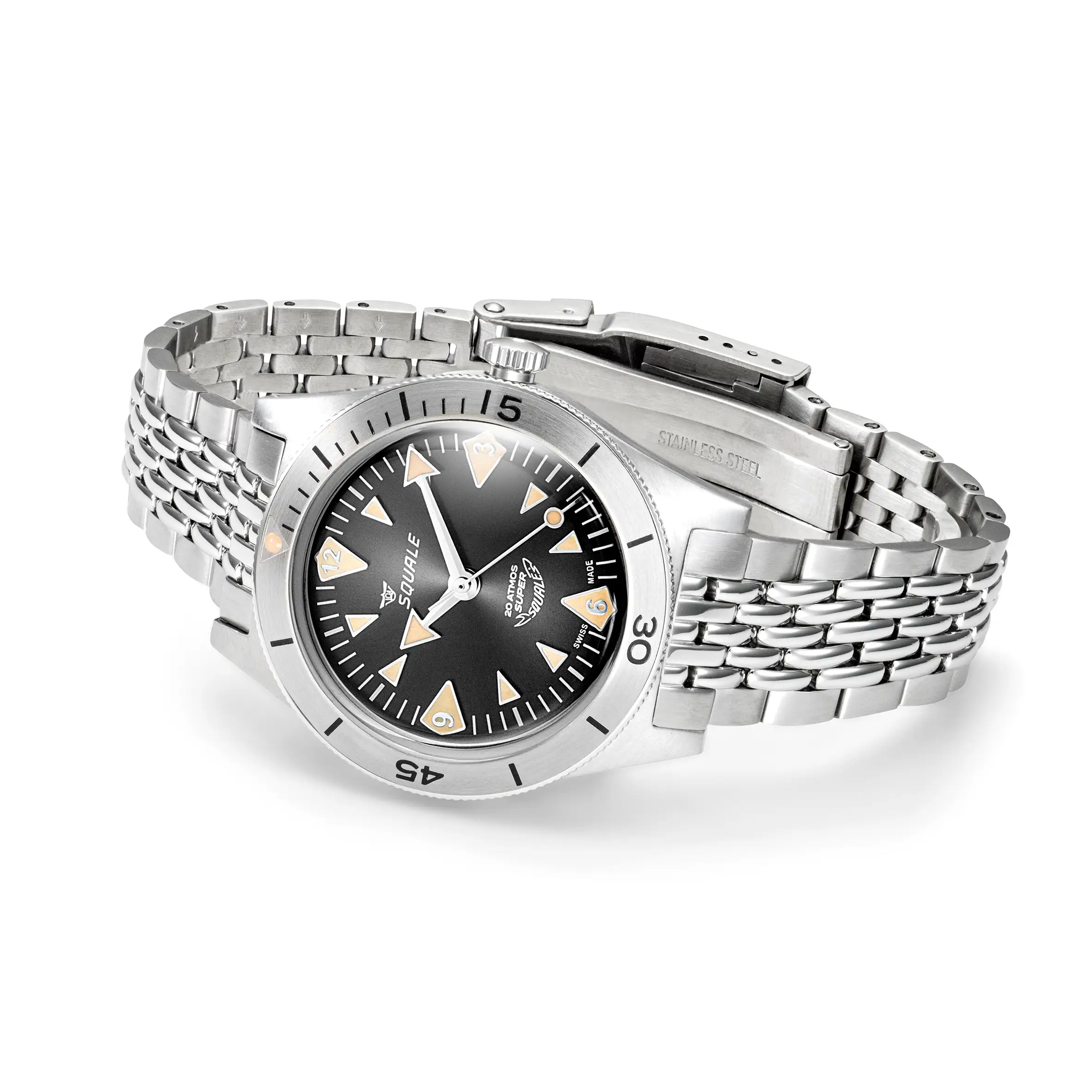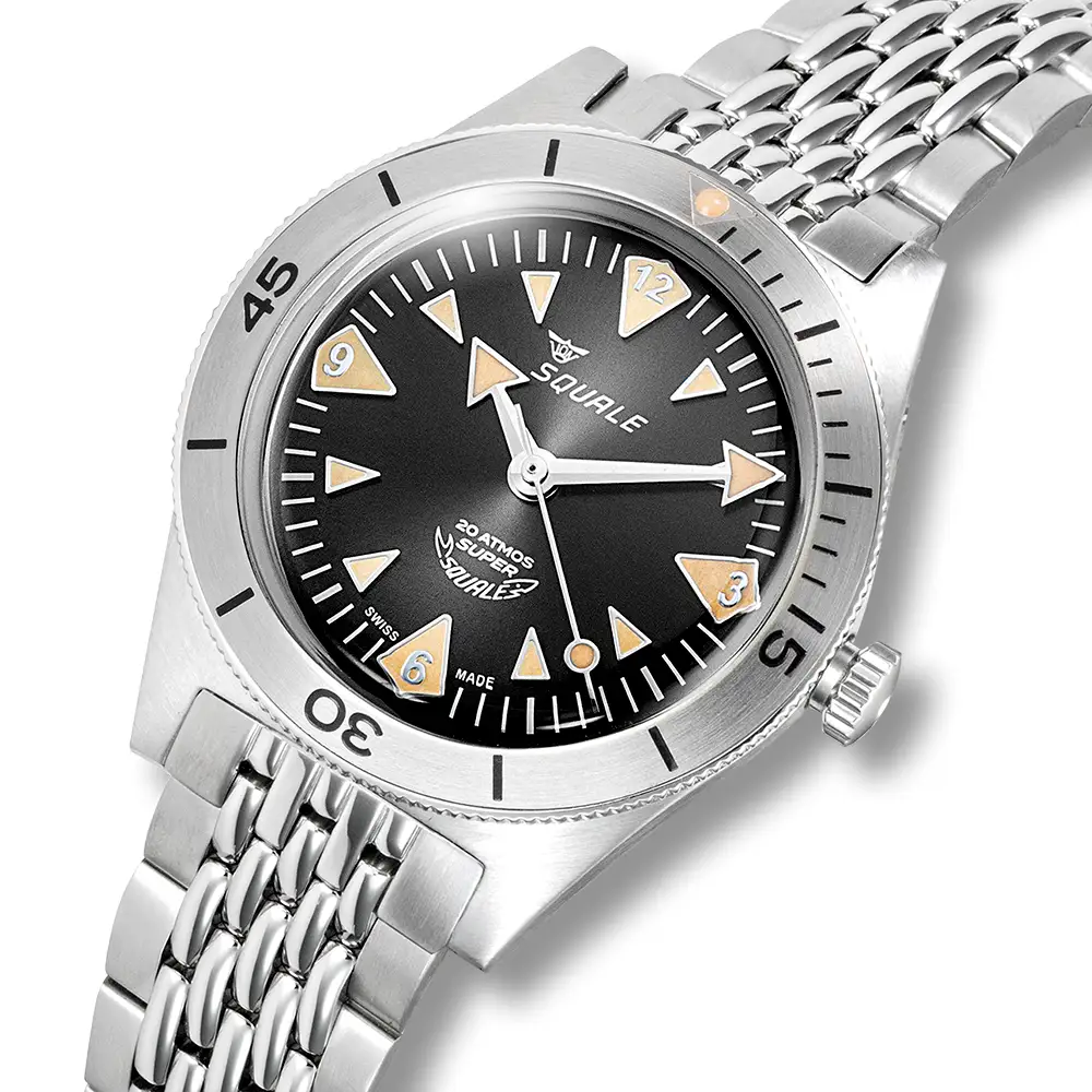 Squale Super Squale Big Arrows w wersji z czarną tarczą to hołd dla klasycznych diverów, stworzony dla tych, którzy cenią połączenie autentycznego designu, solidnej konstrukcji i szwajcarskiej precyzji.