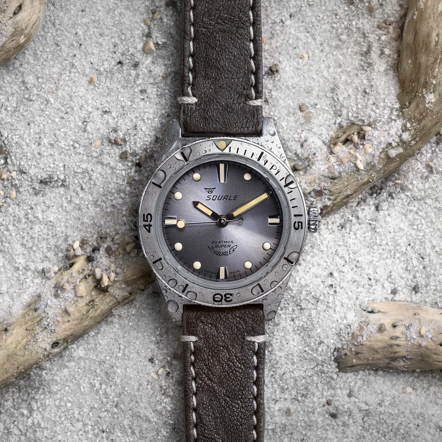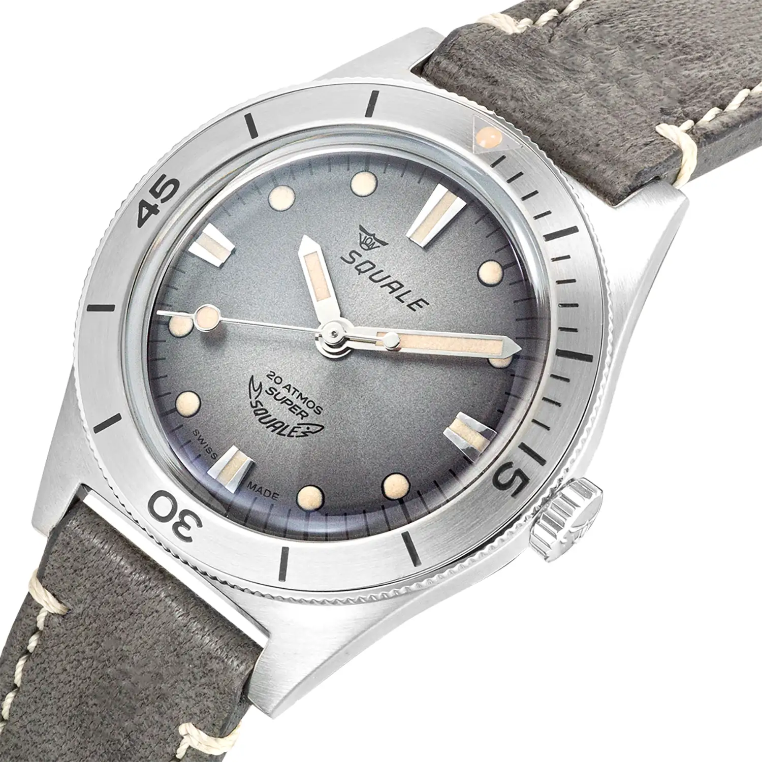 Squale Super Squale SUPERSSG.PG to zegarek, który harmonijnie łączy ducha klasycznych diverów z lat 60. z nowoczesnym wykonaniem i detalami w stylu vintage. Ta wersja przyciąga uwagę stonowaną szarością – zarówno na matowej tarczy, jak i na starannie wykończonym pasku skórzanym Made in Italy z białym kontrastowym szyciem. Efekt? Czasomierz o wyjątkowej równowadze między elegancją a sportową funkcjonalnością.