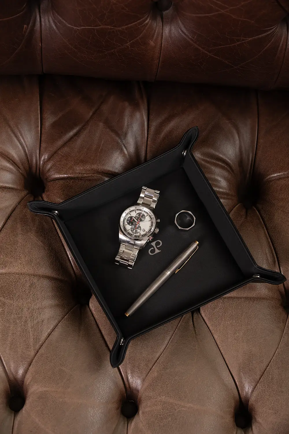 WOLF Philipp 190208 to elegancka tacka typu snap valet tray, zaprojektowana z myślą o codziennej organizacji drobnych przedmiotów – od spinek do mankietów po monety, klucze czy biżuterię. To stylowe i praktyczne rozwiązanie, które pomoże Ci utrzymać porządek na biurku, komodzie lub w garderobie.
