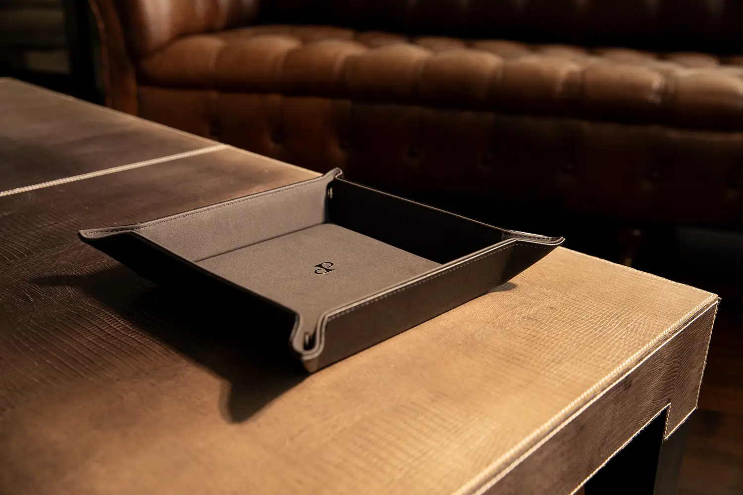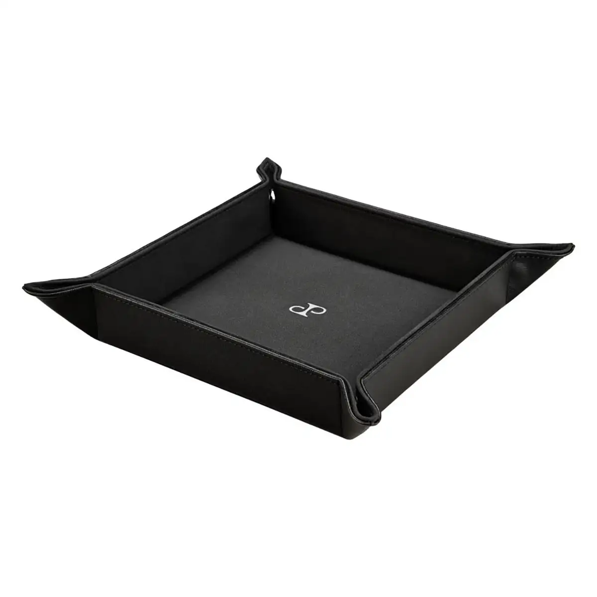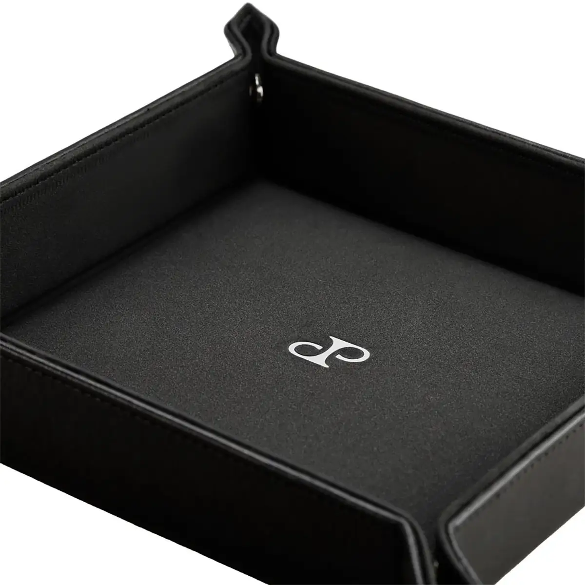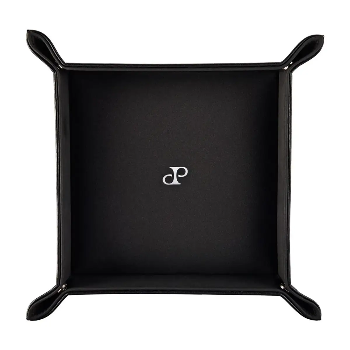 Model został wykonany ręcznie z czarnej, tłoczonej wegańskiej skóry i wyściełany od środka miękkim nubukiem wegańskim w tym samym odcieniu. Cztery narożniki zapinane na napy pozwalają szybko złożyć tackę i zabrać ją ze sobą – np. w podróż. Minimalistyczne wzornictwo uzupełnia srebrne logo „DP”, charakterystyczne dla kolekcji Philipp.