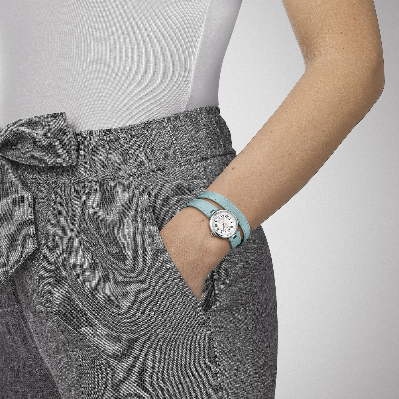 Zegarek z paskiem do podwójnego owinięcia Tissot T126.010.16.113.00 posiada na swej szykownej tarczy masę perłową, która rozkoszuje oko subtelnym i czystym połyskiem prosto z wnętrza morskich muszli. Nie mniejsze znaczenie ma typografia oddana w wyrafinowany tradycyjny sposób. Koperta, której lunetę zdobią wspaniałe kamienie, jest drobna i okrągła, a wykonana ze stali szlachetnej. Jej średnica to 26 mm. Delikatnie nad jej linią znajduje się wysoce odporne na zarysowania szkło szafirowe z dwustronną powłoką antyrefleksyjną. Na godzinie trzeciej mieści się koronka służąca do ustawiania czasu. Zdobi ją biały ceramiczny kaboszon. Bardzo wygodny w noszeniu, stylowy i lekki pasek w kolorze miętowym/jasnoniebieskim jest uszyty z tłoczonej skóry bydlęcej, zapinany na klasyczną sprzączkę. Charakterystyczny krój umożliwia podwójne owinięcie wokół nadgarstka, co pozwala otrzymać bardzo modny efekt.