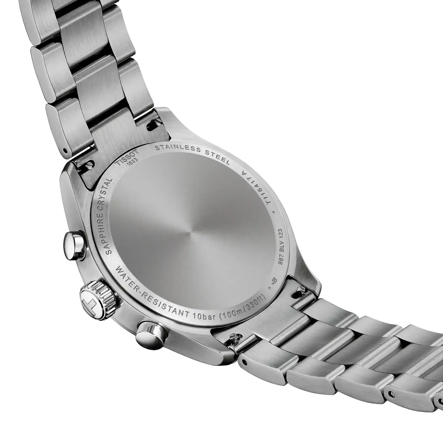 Stalowa koperta o dopracowanych proporcjach została zestawiona z głęboką, niebieską tarczą, na której wyraźnie zaznaczono wszystkie wskazania chronografu. Czasomierz wyposażono w odporne na zarysowania szkło szafirowe z antyrefleksem oraz wodoszczelność do 100 metrów, co zwiększa jego praktyczność w codziennym użytkowaniu. Srebrna bransoleta ze stali Tissot dodaje całości klasycznego i silnego charakteru, co zapewnia komfort i stabilność w czasie noszenia. Całość napędza precyzyjny mechanizm szwajcarski, gwarantujący dokładność i niezawodność.