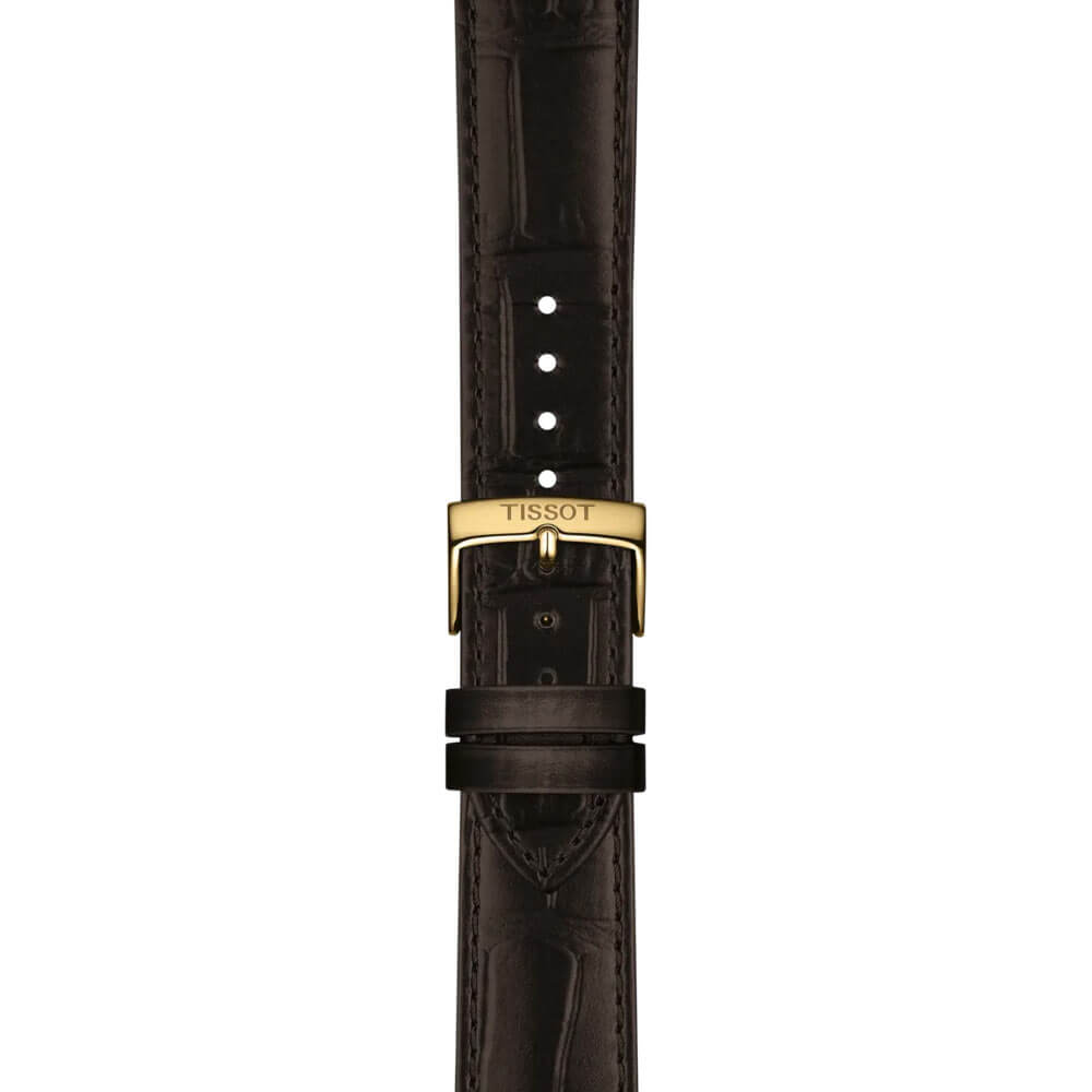 Koperta w kolorze złotym PVD o średnicy 40 mm wykonana została ze stali szlachetnej 316L, dzięki czemu zachowuje odporność na korozję i wieloletnią trwałość. Na nadgarstku zegarek prezentuje się lekko, a dzięki klasycznej formie ma ponadczasowy urok, który nie poddaje się zmieniającym się trendom. Pasek z naturalnej skóry z systemem szybkiej wymiany pozwala na łatwe dopasowanie zegarka do własnego stylu – w kilka sekund można zastąpić go bransoletą lub paskiem gumowym marki Tissot. Całość uzupełnia odporne na zarysowania szkło szafirowe oraz stalowy dekiel, który szczelnie chroni wnętrze mechanizmu.