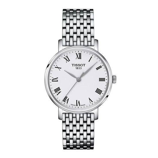 Front szwajcarskiego zegarka Tissot osłonięty został wysokiej jakości szkłem szafirowym. Chroni ono srebrny cyferblat, który promieniuje elegancją. Pełne godziny, oznaczone zostały cyframi rzymskimi, którym towarzyszą skromne indeksy liniowe. Aktualny czas wskazują smukłe wskazówki. Na godzinie dwunastej znalazło się dumne logo marki Tissot. Pod tarczą zainstalowany został mechanizm szwajcarski ETA Swiss Made z funkcją EOL. Etykieta Swiss Made gwarantuje solidność i dokładność tego mechanizmu. ETA z komplikacją End Of Life to mechanizm, który poinformuje o końcu żywotności baterii — wskazówka sekundowa zmieni tryb pracy i zacznie przeskakiwać indeksy co kilka sekund.