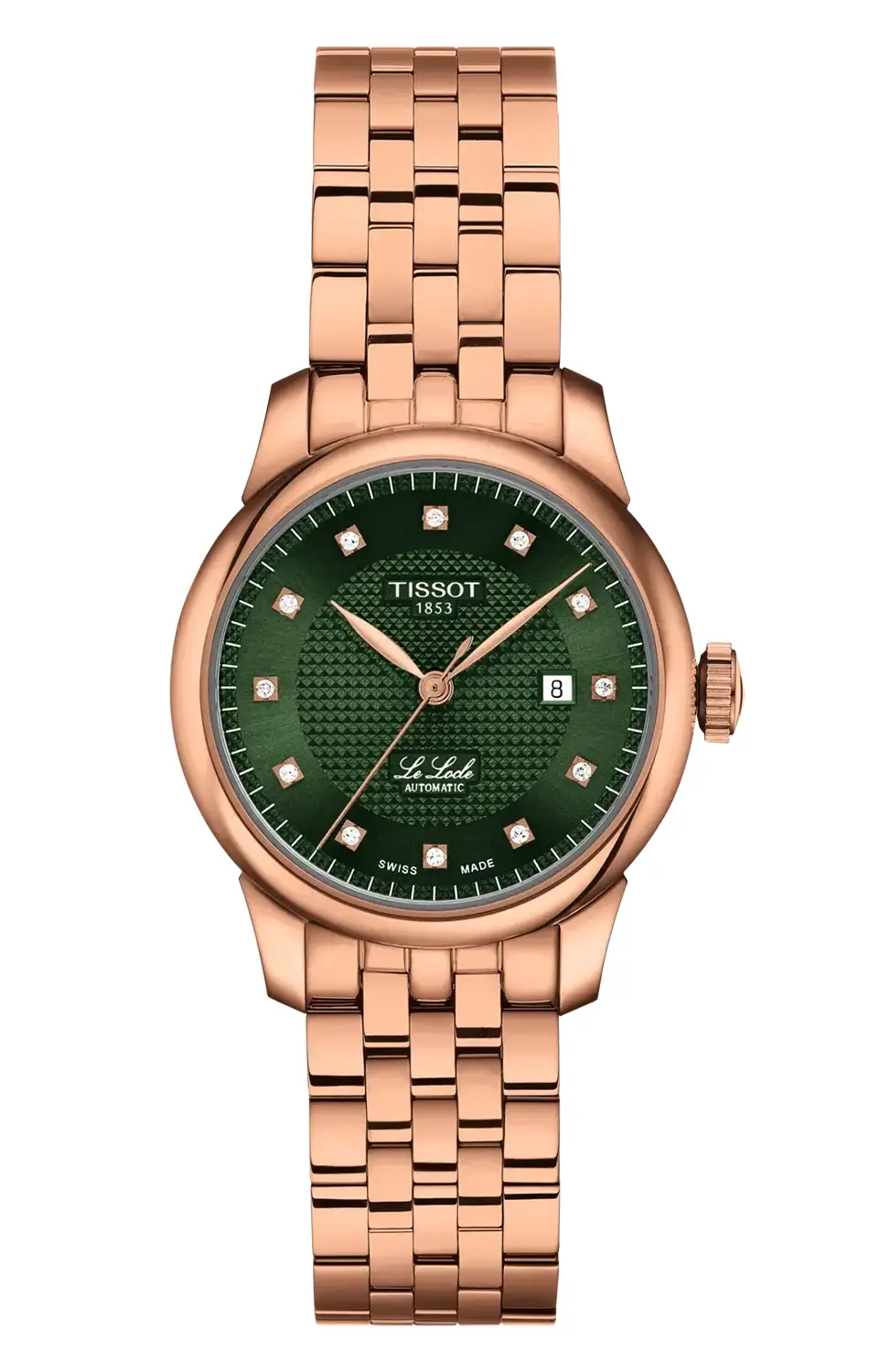 Zielona tarcza o subtelnym wzorze giloszowania ozdobiona została 12 prawdziwymi diamentami, które pełnią funkcję indeksów godzinowych. Ich blask w połączeniu z ciepłym tonem różowego złota tworzy niezwykle elegancki efekt, podkreślający charakter czasomierza. Na godzinie trzeciej umieszczono datownik, który dodaje zegarkowi funkcjonalności.