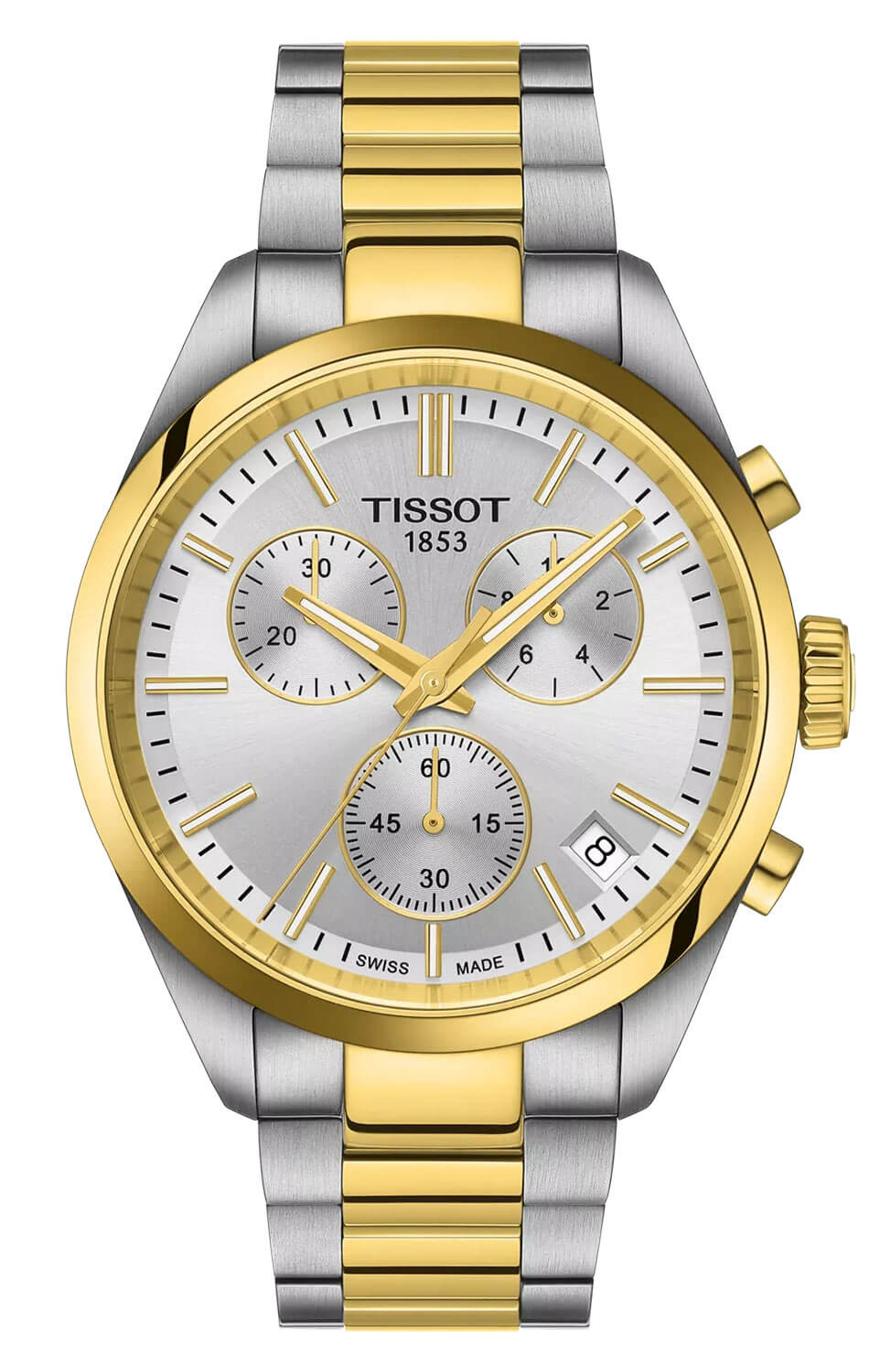Sportowy zegarek męski Tissot na stalowej bransolecie bicolor. Napędzany szwajcarskim mechanizmem ETA z chronografem. Twarde szkło szafirowe przykrywa funkcjonalną tarczę. Beznarzędziowy system wymiany bransolety.