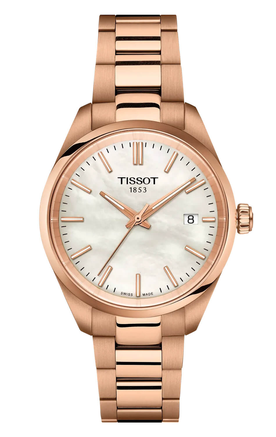 Tarcza z naturalnej masy perłowej z unikatowym wzorem idealnie współgra z indeksami i wskazówkami w kolorze różowego złota. Na godzinie trzeciej umieszczono datownik, który dodaje praktyczności bez zaburzania eleganckiej kompozycji. Sercem zegarka jest szwajcarski mechanizm kwarcowy ETA F05.115 z funkcją End Of Life, informującą o konieczności wymiany baterii. Tissot T150.210.33.111.00 na bransolecie to wyrafinowany czasomierz dla kobiet, które oczekują połączenia niezawodnej technologii, luksusowego wyglądu i uniwersalnego stylu – w pełni zgodnego z tradycją Swiss Made. Ten model to doskonały wybór dodatku do lekkiej sukienki, eleganckiego garnituru, a nawet do sportowego ubioru — zegarek jest modny kolorystycznie, co ułatwia dopasowanie go do różnego rodzaju biżuterii.