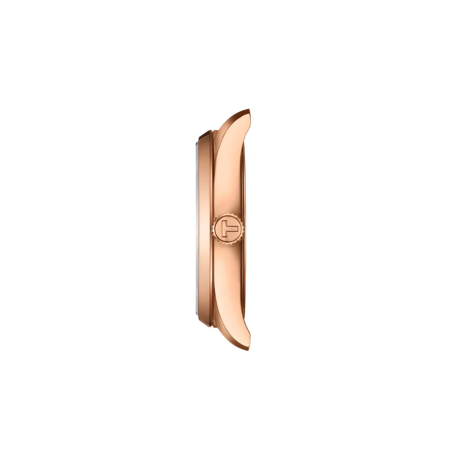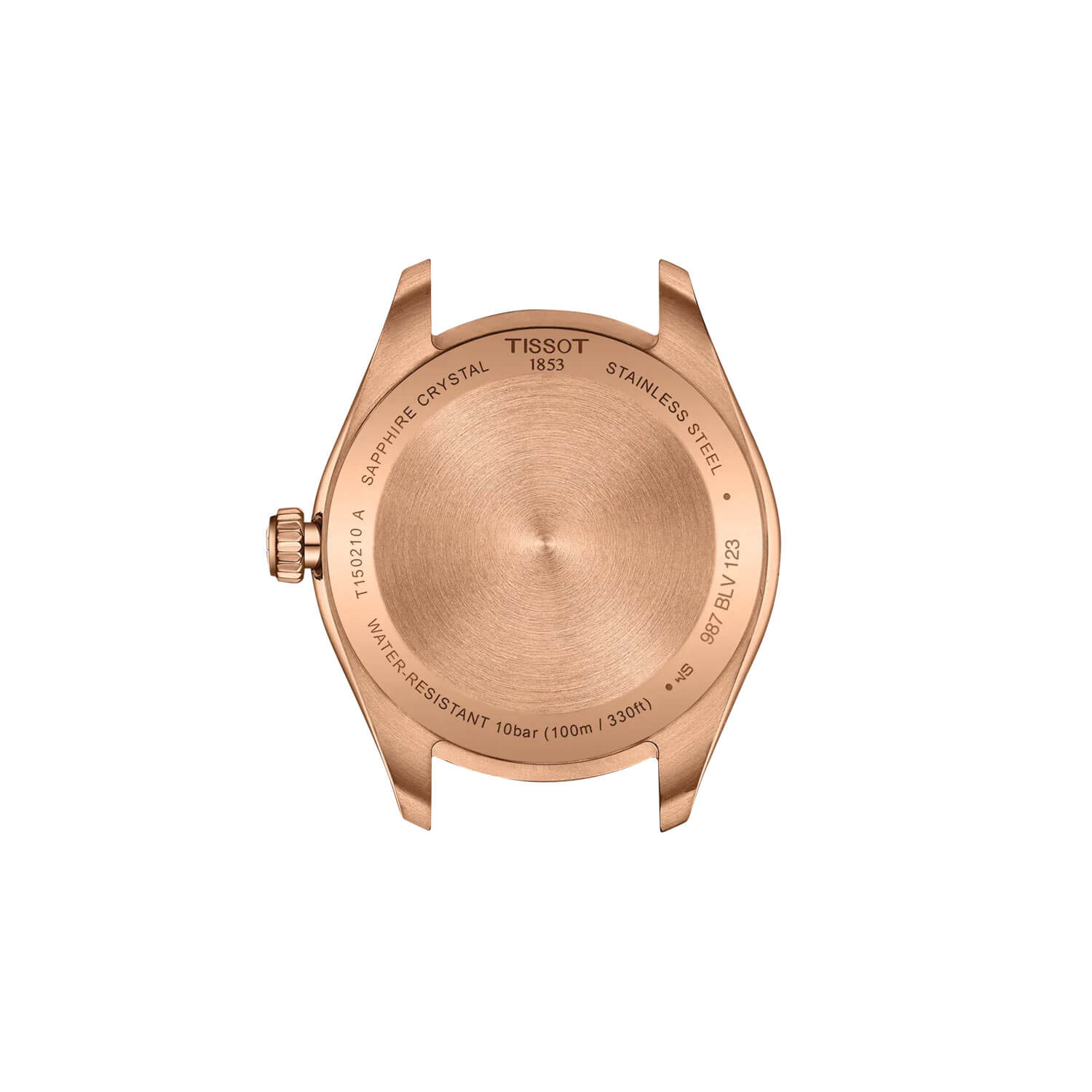 Brązowa tarcza o satynowym połysku idealnie współgra z indeksami i wskazówkami w kolorze różowego złota. Na godzinie trzeciej umieszczono datownik, który dodaje praktyczności bez zaburzania eleganckiej kompozycji. Sercem zegarka jest szwajcarski mechanizm kwarcowy ETA F05.115 z funkcją End Of Life, informującą o konieczności wymiany baterii. Tissot T150.210.33.291.00 na bransolecie to wyrafinowany czasomierz dla kobiet, które oczekują połączenia niezawodnej technologii, luksusowego wyglądu i uniwersalnego stylu – w pełni zgodnego z tradycją Swiss Made. Ten model to doskonały wybór dodatku do lekkiej sukienki, eleganckiego garnituru, a nawet do sportowego ubioru — zegarek jest modny kolorystycznie, co ułatwia dopasowanie go do różnego rodzaju biżuterii.