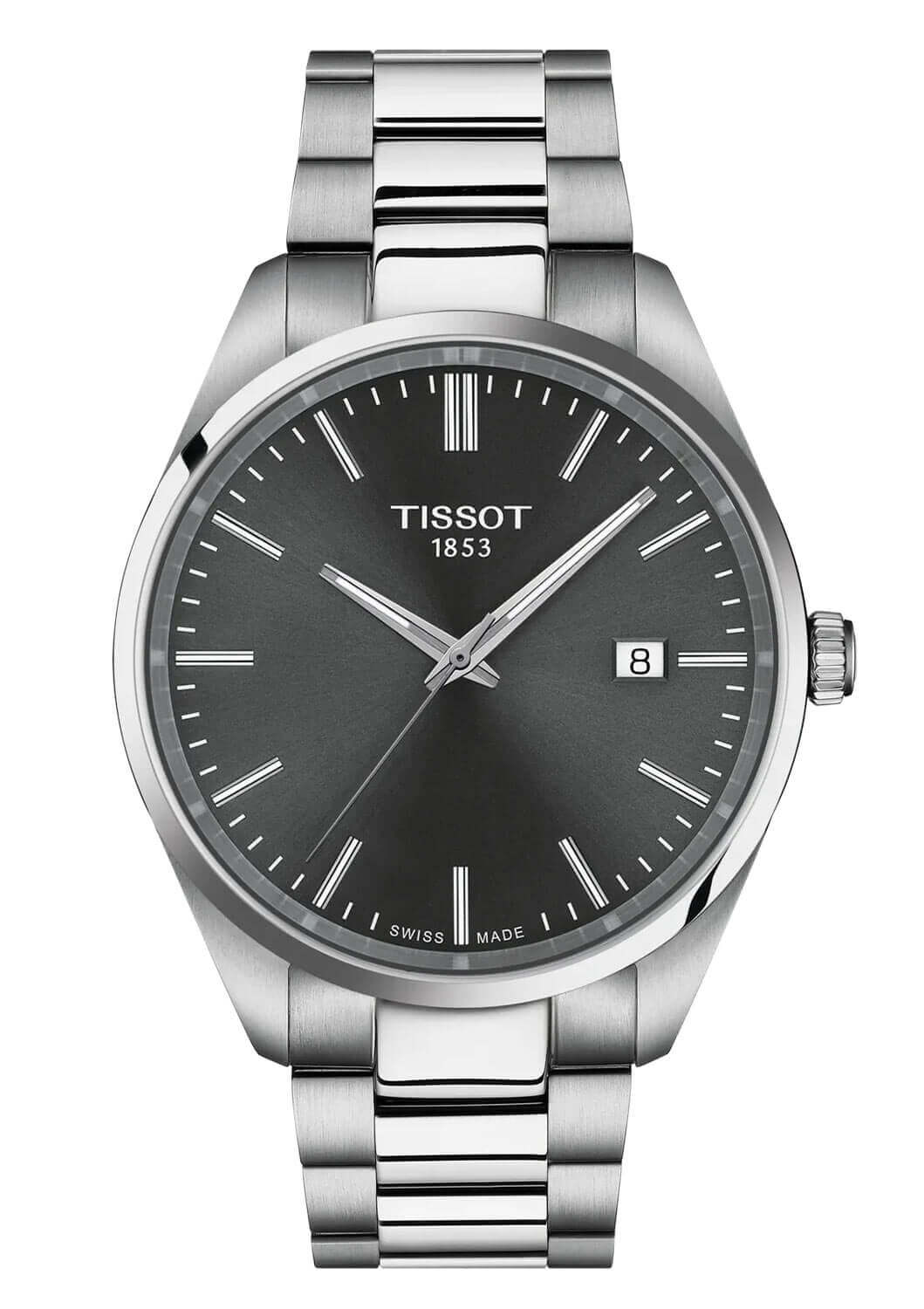 Minimalistyczna szara tarcza stanowi przykład doskonałej równowagi między prostotą a elegancją. Smukłe wskazówki i indeksy nadają jej biżuteryjnego charakteru, a okienko datownika na godzinie trzeciej dodaje praktycznego akcentu. Pod tarczą pracuje precyzyjny mechanizm szwajcarski ETA F06.115 Swiss Made z funkcją End Of Life, która informuje o konieczności wymiany baterii poprzez przeskakiwanie sekundnika co kilka sekund. Tissot PR 100 T150.410.11.081.00 na bransolecie to czasomierz, który doskonale łączy szwajcarską precyzję z ponadczasową estetyką – idealny zarówno do garnituru, jak i smart casualowych stylizacji.