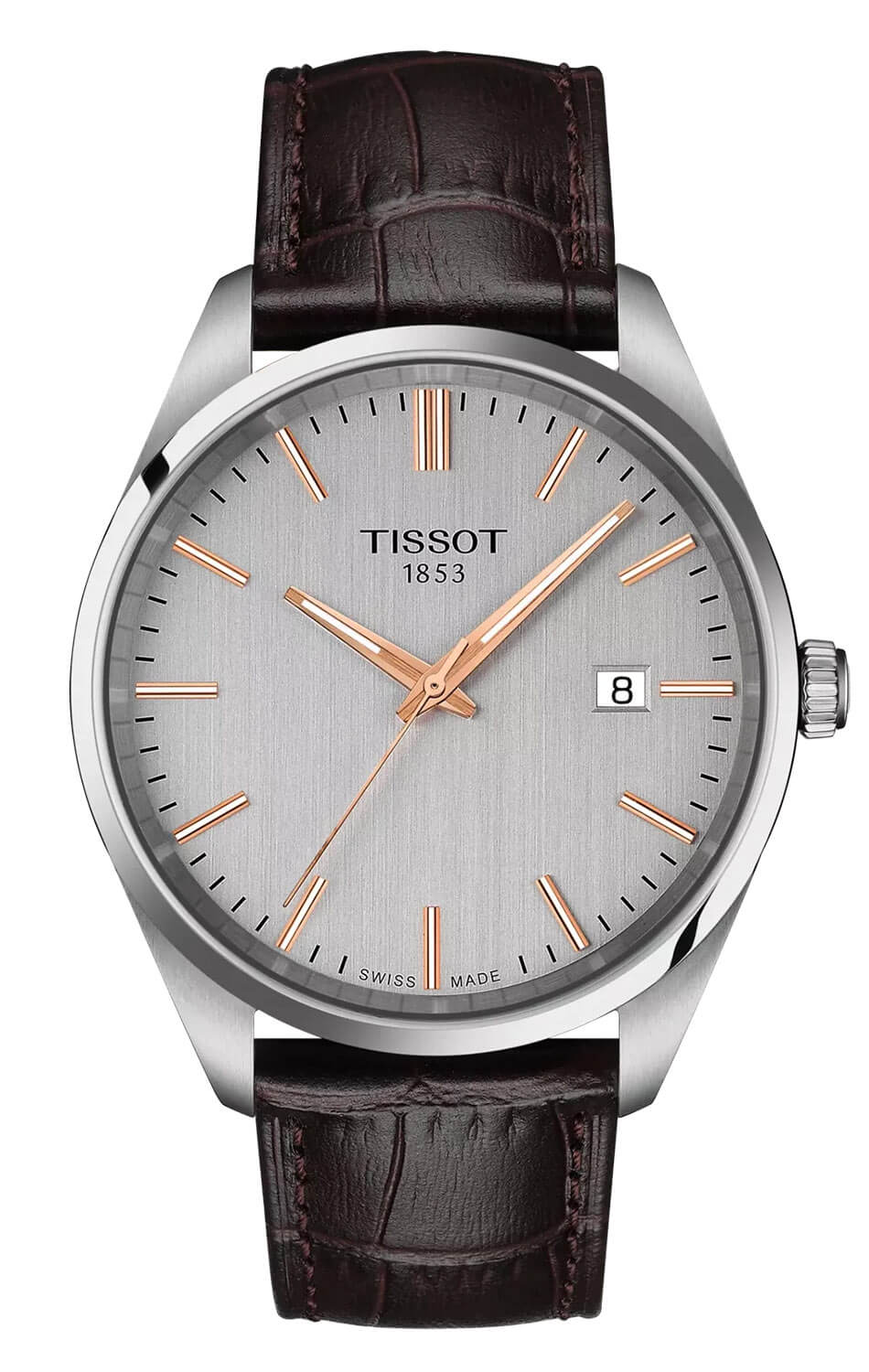 Szwajcarski zegarek męski Tissot PR 100 od frontu zabezpieczony został transparentnym szkłem szafirowym. Chroni ono bardzo czytelną i minimalistyczną tarczę w kolorze srebrnym. Producent zadbał o fanów minimalistycznych wykończeń. Na tarczy znajdują się pozłacane wskazówki oraz indeksy. Wypełnione zostały świecącą masą Super-Luminova® Swiss Made, która pomoże odczytać godzinę w gorszym oświetleniu. Na godzinie trzeciej znalazło się okno datownika z aktualnym dniem miesiąca. Datownik z pewnością przyda się zapracowanym Panom. Projekt tarczy pozwala na natychmiastowe odczytanie godziny już po pierwszym spojrzeniu. Pod tarczą zainstalowany został szwajcarski mechanizm ETA Swiss Made. Zasilany baterią werk wyposażony został w funkcję End Of Life, która poinformuje właściciela tego modelu o konieczności wymiany baterii — wskazówka sekundowa przeskakiwać będzie indeksy co kilka sekund.
