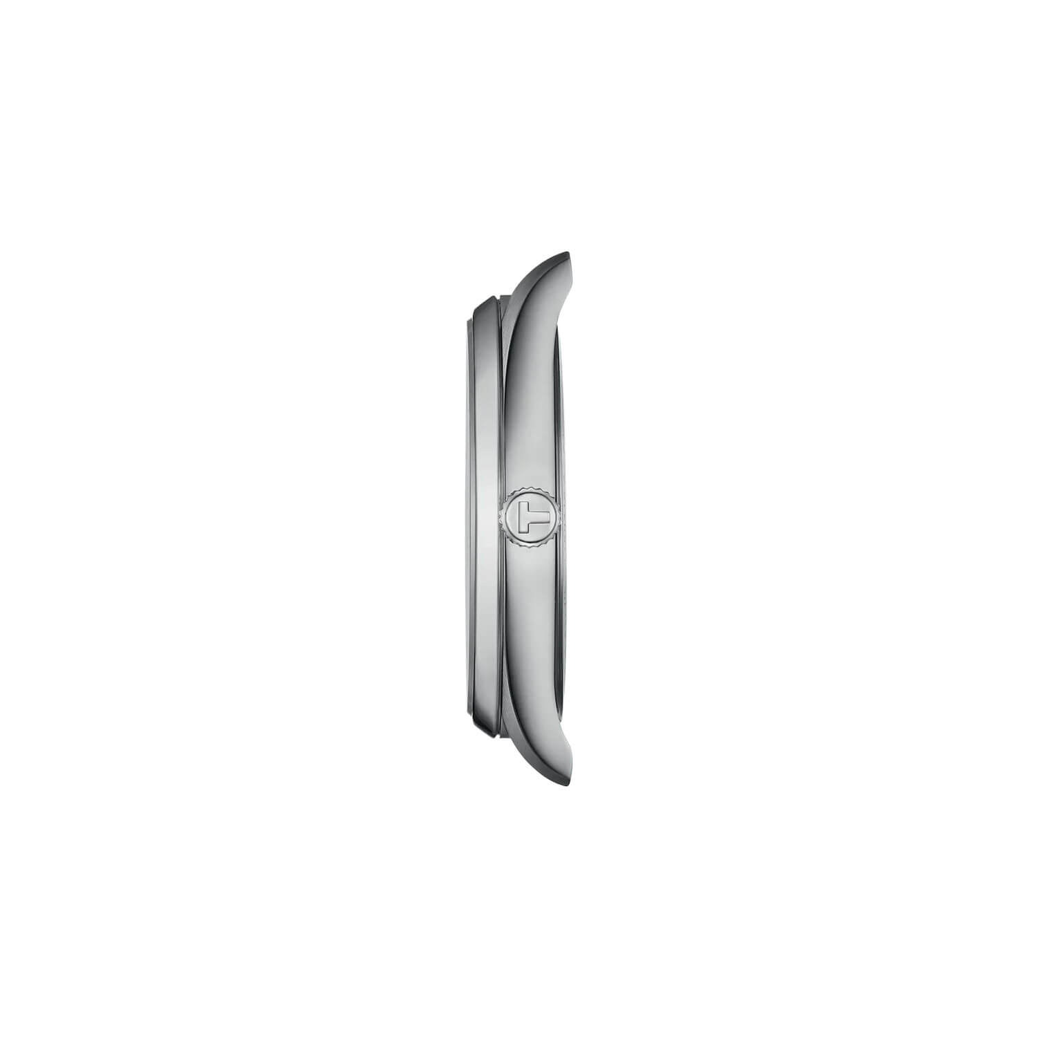 Szwajcarski zegarek męski Tissot PR 100 od frontu zabezpieczony został transparentnym szkłem szafirowym. Chroni ono bardzo czytelną i minimalistyczną tarczę w kolorze srebrnym. Producent zadbał o fanów minimalistycznych wykończeń. Na tarczy znajdują się pozłacane wskazówki oraz indeksy. Wypełnione zostały świecącą masą Super-Luminova® Swiss Made, która pomoże odczytać godzinę w gorszym oświetleniu. Na godzinie trzeciej znalazło się okno datownika z aktualnym dniem miesiąca. Datownik z pewnością przyda się zapracowanym Panom. Projekt tarczy pozwala na natychmiastowe odczytanie godziny już po pierwszym spojrzeniu. Pod tarczą zainstalowany został szwajcarski mechanizm ETA Swiss Made. Zasilany baterią werk wyposażony został w funkcję End Of Life, która poinformuje właściciela tego modelu o konieczności wymiany baterii — wskazówka sekundowa przeskakiwać będzie indeksy co kilka sekund.