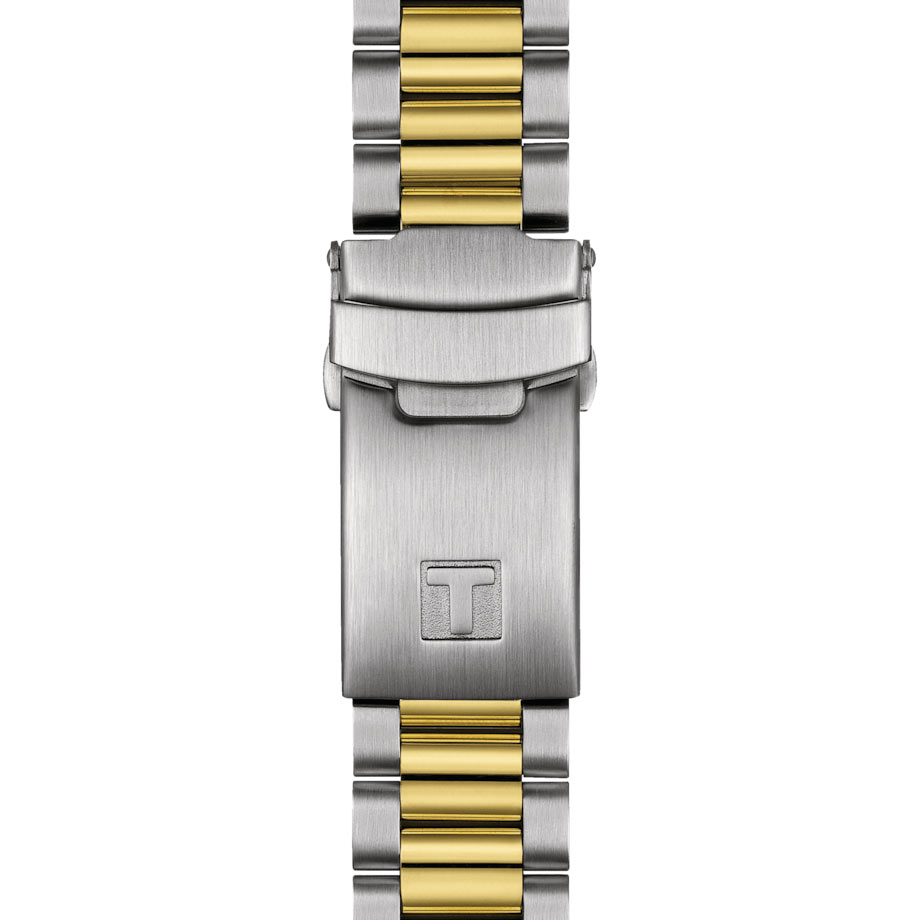 Jego solidny design obejmuje zwężaną 40-milimetrową kopertę ze stali szlachetnej z powłoką PVD, nadając mu dynamiczny i niepowtarzalny wygląd. Koperta w zestawieniu z solidną srebrno-złotą bransoletą ze stali, tworzy eleganckie i nowoczesne połączenie. Zapięcie motylkowe na stalowej bransolecie zapewnia nie tylko bezpieczeństwo, ale także wygodę noszenia. Dwa przyciski po prawej stronie obudowy umożliwiają łatwą obsługę chronografu. Zakręcany dekiel na rewersie potwierdza wodoszczelność zegarka do głębokości 100 metrów. Zegarek Tissot Chronograph będzie idealnym towarzyszem także podczas pływania. Producent udekorował dekiel grawerem w postaci kierownicy auta rajdowego, oraz liści laurowych.