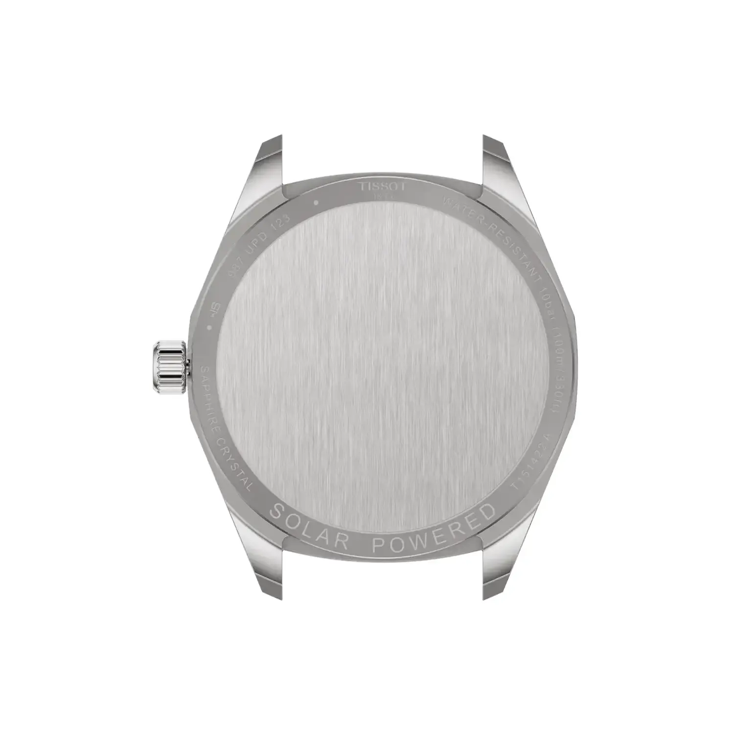 Sercem zegarka jest nowoczesny mechanizm solarny z technologią Lightmaster Solar, który czerpie energię ze światła. Technologia Lightmaster Solar wykorzystuje zaawansowane ogniwa fotowoltaiczne, płynnie zintegrowane pod szafirowym szkłem. Zamiast tradycyjnej baterii zastosowano tu akumulator ładowany zarówno światłem słonecznym, jak i sztucznym - wystarczy codzienna ekspozycja na dowolne źródło światła, aby czasomierz działał nieprzerwanie. Pełne naładowanie mechanizmu pozwala na pracę czasomierza przez wiele tygodni, a gdy poziom energii zbliża się do wyczerpania, specjalny wskaźnik End Of Energy (E.O.E.) daje o tym znać. Funkcja ta sygnalizuje niski stan zasilania na przykład skokowym ruchem sekundnika, dyskretnie informując, że nadchodzi pora, by doładować zegarek światłem. Tarcza zegarka Tissot PRC 100 Solar Quartz została zaprojektowana tak, by efektywnie przepuszczać promienie do paneli słonecznych, a zarazem zachwycać dopracowanym wyglądem. Posiada czytelne indeksy godzinowe i elegancko wyprofilowane wskazówki pokryte luminescencyjną powłoką Super-LumiNova®, co umożliwia odczyt czasu w ciemności. Na tarczy umieszczono również praktyczny datownik, dyskretnie wkomponowany w projekt. Na tarczy znalazły się także logo Tissot oraz napis "Solar" pod nazwą kolekcji PRC 100, które dyskretnie podkreślają obecność nowoczesnej technologii w klasycznej formie zegarka.