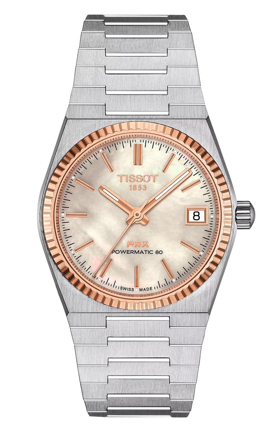 "Innovation by Tradition", to słynna dewiza producenta szwajcarskich zegarków Tissot, która najlepiej wyraża mistrzowski talent marki do tworzenia projektów inspirowanych oryginałami z lat wcześniejszych, adekwatnych do bieżących czasów. Powyższy, szwajcarski zegarek mechaniczny Tissot PRX 35 mm 18K Rose Gold to model ze wspomnianą różowo-złotą lunetą, a także delikatną, płaską kopertą w kształcie tonneau, masą perłową, złotymi wskazówkami pokrytymi masą Super-LumiNova oraz stalową bransoletą z szerokimi, poprzecznymi ogniwami (odpowiednio dla designu z końca lat 70.), pozbawioną uszu, dzięki czemu płynnie zintegrowaną z kopertą. Korpus stanowi połączenie pionowego, szczotkowanego wykończenia i skośnego polerowania. System i konstrukcja bransolety umożliwiają idealne przyleganie oraz ergonomiczne dopasowanie czasomierza do każdego typu nadgarstka.