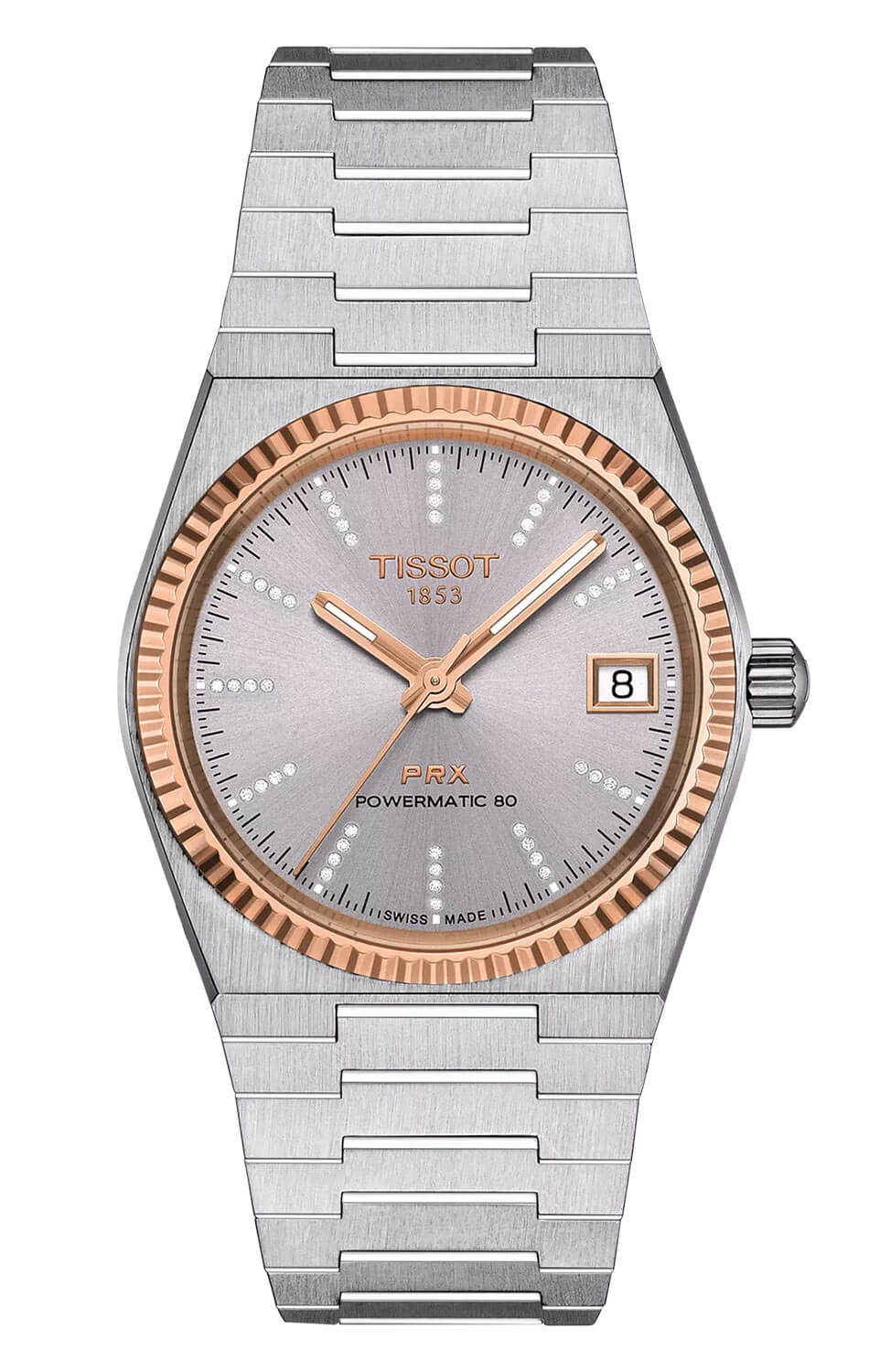Tissot PRX Powermatic 80 T931.207.41.336.00 — klasyczny zegarek damski z 44 diamentami na tarczy, pierścieniem z 18-karatowego różowego złota oraz szwajcarskim mechanizmem mechanicznym Powermatic 80 z 80-godzinną rezerwą chodu i antymagnetyczną sprężyną balansu Nivachron™. Luksusowa reedycja kultowego modelu Tissot z lat 70.