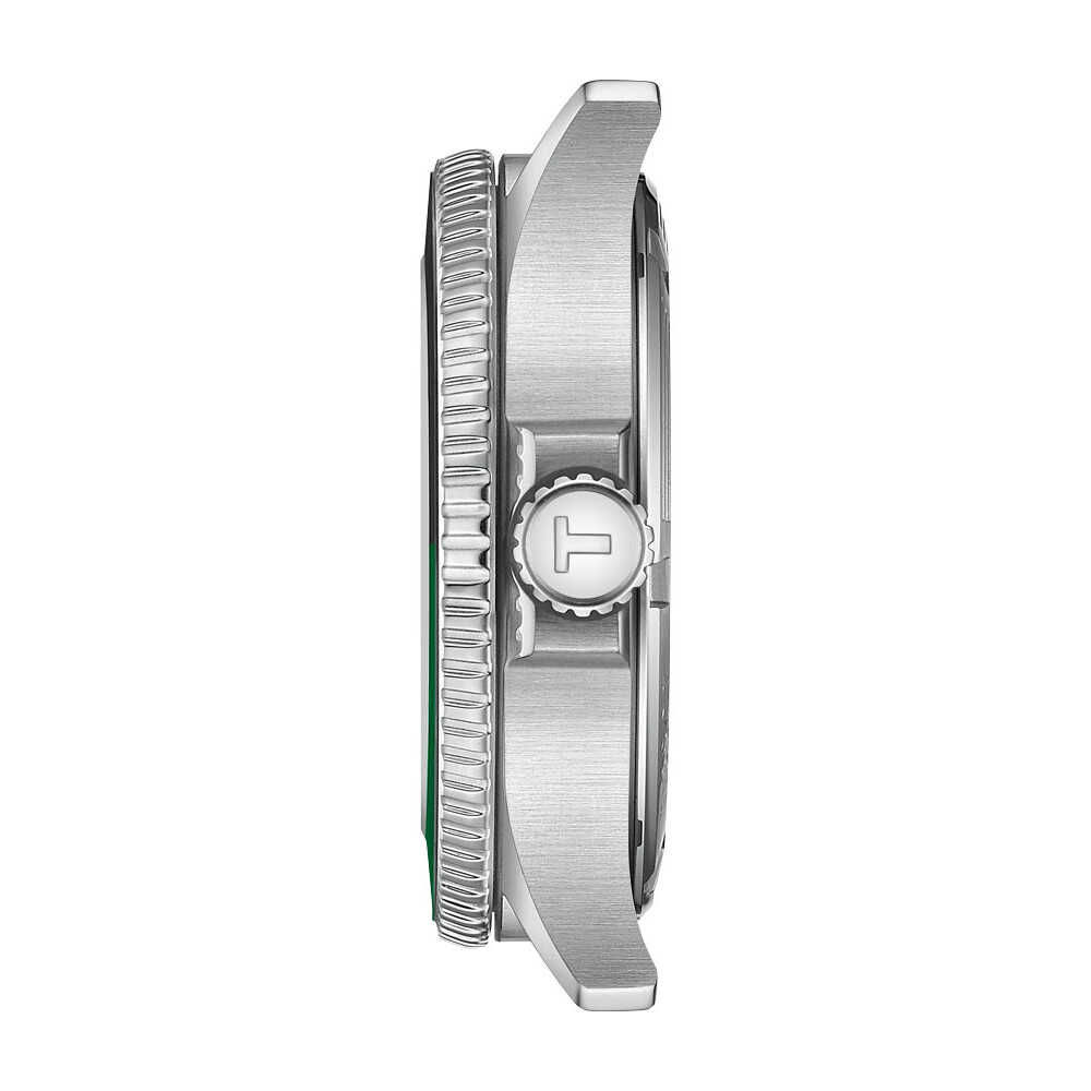 Zegarek męski Tissot T1208521105100 oferowany jest w kompaktowym rozmiarze koperty 40 mm. Wyróżnia się ona wysoką klasą szczelności do 300 metrów. Model ten może towarzyszyć swojemu właścicielowi w czasie pływania, jak i nurkowania. Konstrukcję zamyka zakręcany dekiel ze stali szlachetnej z wygrawerowanym symbolem marki Tissot, jakim jest Konik morski. Po prawej stronie koperty w tradycyjnym miejscu umieszczona została koronka, która jest zakręcana. To kolejny ważny element, który chroni zegarek przed wodą. Zegarek zestawiony został ze stalową bransoletą, która posiada bezpieczne zapięcie motylkowe na dwa przyciski i zatrzask. Bransoleta w wygodny i bezpieczny sposób ułoży się na męskim nadgarstku. Można ją zamienić na pasek skórzany, gumowy lub inną bransoletę, dzięki systemowi szybkiej wymiany, który nie potrzebuje dodatkowych narzędzi.