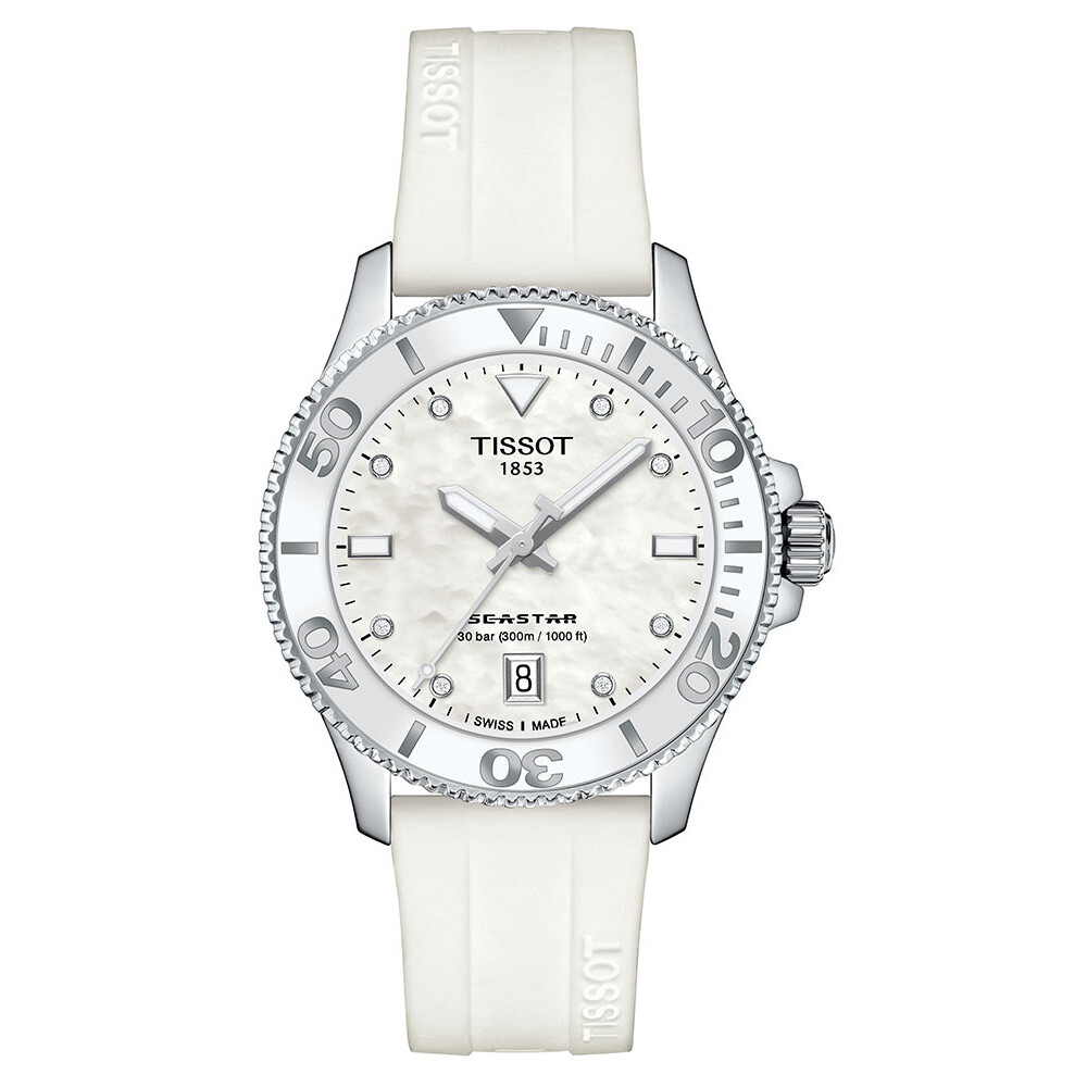 Sportowy charakter damskiego zegarka Tissot Seastar 1000 36 mm widoczny jest na solidnej kopercie i łatwym w pielęgnacji, wodoodpornym białym pasku gumowym. Zmysłowość wprowadza mieniąca się tarcza z prawdziwej masy perłowej, inkrustowana 8 diamentami. Wskazówki pokryte są szwajcarską substancją luminescencyjną Super-Luminova®, gwarantując czytelność w ciemności. Logo Tissot 1883 umieszczone jest przy godzinie 12, a po przeciwnej stronie znajduje się nazwa kolekcji Seastar oraz informacja o odporności na ciśnienie do 30 barów. Datownik otoczony stalową ramką znajduje się tuż pod godziną 6. Błyskawiczny odczyt co do sekundy ułatwia kreskowa skala na krawędzi okrągłego dysku.
