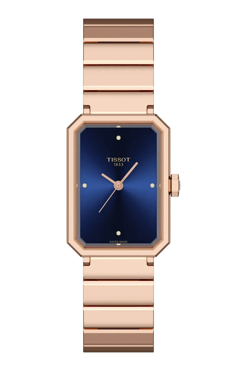 Zegarek damski Tissot w kolorze złotym łączy geometryczną formę z intensywną tarczą ozdobioną diamentami, tworząc wyrazisty akcent biżuteryjny na nadgarstku. Wykonany ze stali szlachetnej i wyposażony w precyzyjny mechanizm kwarcowy z funkcją End Of Life, stanowi eleganckie i niezawodne dopełnienie nowoczesnego stylu.