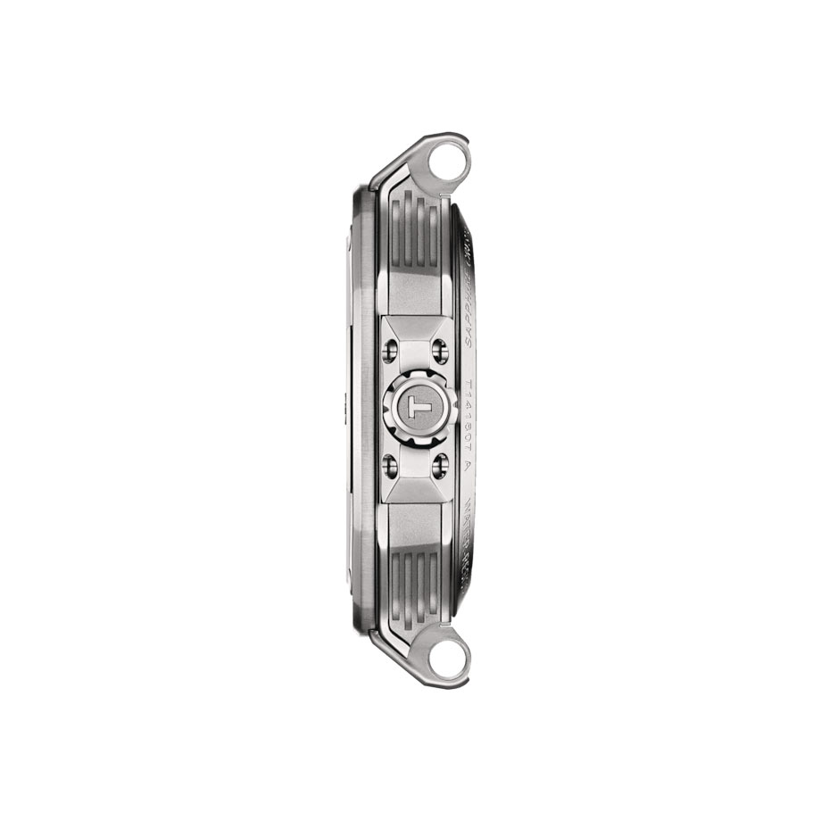 Frontowa część obudowy przykryta została najwyższej jakości szkłem szafirowym z antyrefleksem odbijającym promienie światła. Osłania ono niebieską tarczę z dużymi i wyraźnymi wskazówkami oraz indeksami. Masa luminescencyjna Super-LumiNova® pomoże odczytać godzinę nawet w ciemności. Na godzinie trzeciej pojawiło się okienko datownika, które wskazuje aktualny dzień miesiąca. Pod tarczą umieszczony został mechanizm automatyczny Powermatic 80 ze sprężyną balansową Nivachron™. Sprężyna krzemowa to najnowocześniejsza technologia, która zwalcza pole magnetyczne, co zwiększa precyzję odmierzania czasu. Ten skomplikowany szwajcarski werk oferuje wysoką rezerwę chodu do 80 godzin. Automatyczny zegarek Tissot na bransolecie chwali się swoją solidnością, jak i precyzją. Bezkompromisowy projekt, który wyróżni się na każdym męskim nadgarstku. Tissot T-Race Automatic będzie doskonałym uzupełnieniem garderoby każdego mężczyzny.