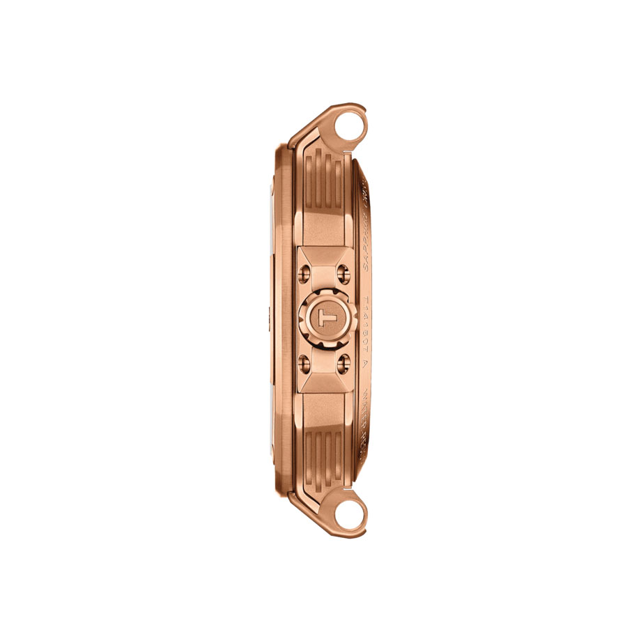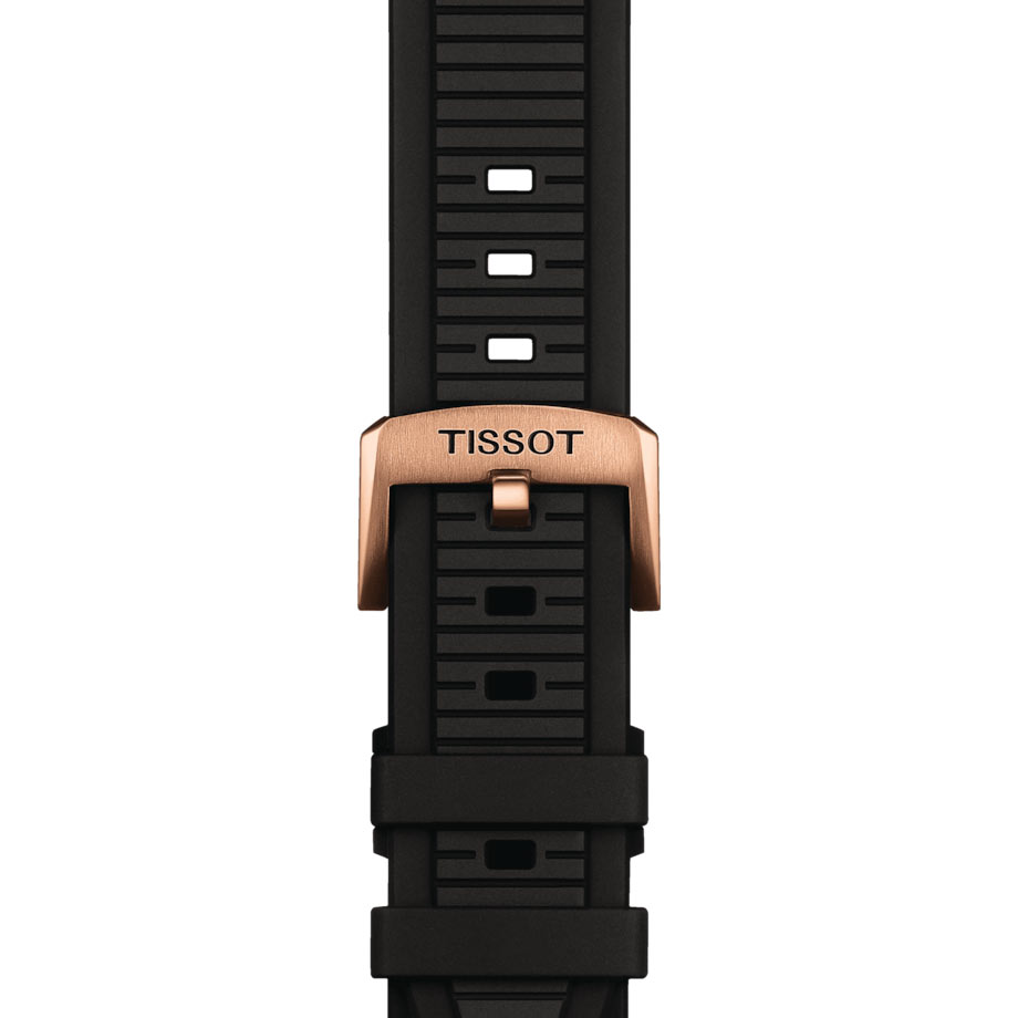 Zegarek męski Tissot T-Race Powermatic 80 T1418073705100 oferowany jest w rozmiarze 41 mm. Koperta ze stali szlachetnej w kolorze różowo-złotym PVD wzbogacona jest o detale wzorowane światem motocykli. Pozłacany bezel z sześcioma ozdobnymi śrubami i osłona koronki są inspirowane tarczą hamulcową i jej zaciskiem. Rewers obudowy prezentuje przezroczysty dekiel, który umożliwia obserwację pracy mechanizmu. Zegarek Tissot jest wodoszczelny do głębokości 100 metrów, co gwarantuje bezpieczeństwo pracy mechanizmu w czasie pływania. Producent swój automatyczny zegarek TISSOT T-Race zestawił z elastycznym paskiem gumowym, który zapewni komfort w czasie noszenia.