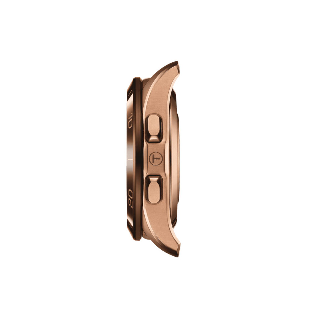 Dodatkowo solarny zegarek T-Touch Connect Sport T1534204705105 jest wyposażony w dotykowe szkło szafirowe, opracowane przez TISSOT, zapewniające doskonałą ochronę przed zarysowaniami. Wyposażony jest również w ekran AMOLED, który reaguje zarówno na bezpośredni dotyk, jak i na boczne przyciski. Interaktywną tarczę otacza elegancki ceramiczny pierścień lunety z 60-minutową podziałką. Kopertę 43.75 mm tego inteligentnego zegarka wykonano z hipoalergicznego i antymagnetycznego tytanu pokrytego różowozłotą powłoką PVD, co sprawia, że jest lekka i doskonale wykończona szczotkowanym i polerowanym wykończeniem. Silikonowy, wymienny pasek w kolorze różowego złota posiada standardowe zapięcie i długości: godz. 6, 102.80 mm, godz. 12, 66.75 mm.
