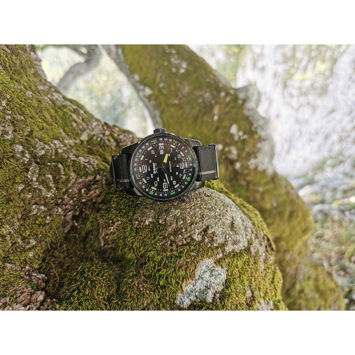P68 Pathfinder to połączenie szwajcarskiej precyzji i przydatnych funkcji. Model ten napędza dobrze znany miłośnikom zegarmistrzostwa, mechanizm automatyczny ETA 2824-2. Odpowiada on za precyzyjne odmierzanie czasu oraz wskazywanie daty. Najważniejszą funkcją w czasomierzu jest kompas, który będzie widoczny w dzień, podczas zachodu słońca, jaki w nocy. Indeksy arabskie i kierunki geograficzne są wypełnione substancją SupeLuminova®, natomiast pozostałe indeksy to prostokątne rurki z trytem, które są też osadzone na wskazówkach. Obudowa wykonana ze stali szlachetnej o średnicy 46 mm jest pokryta czarną powłoką PVD. Tekstylny pasek w kolorze czarnym z szarym pasem nawiązuje do kolorystyki zegarka.