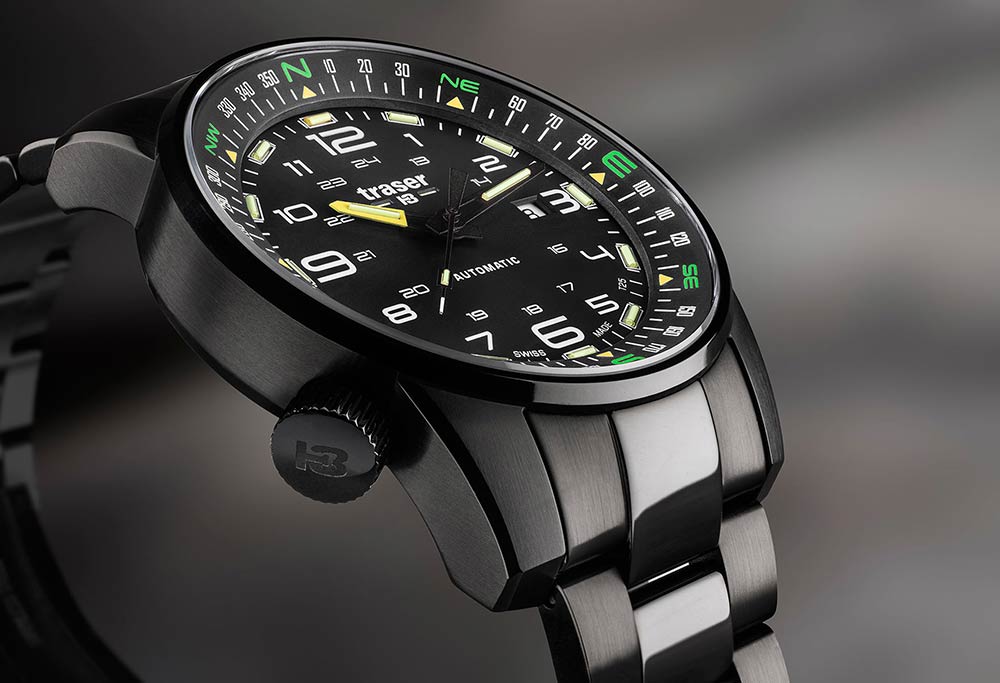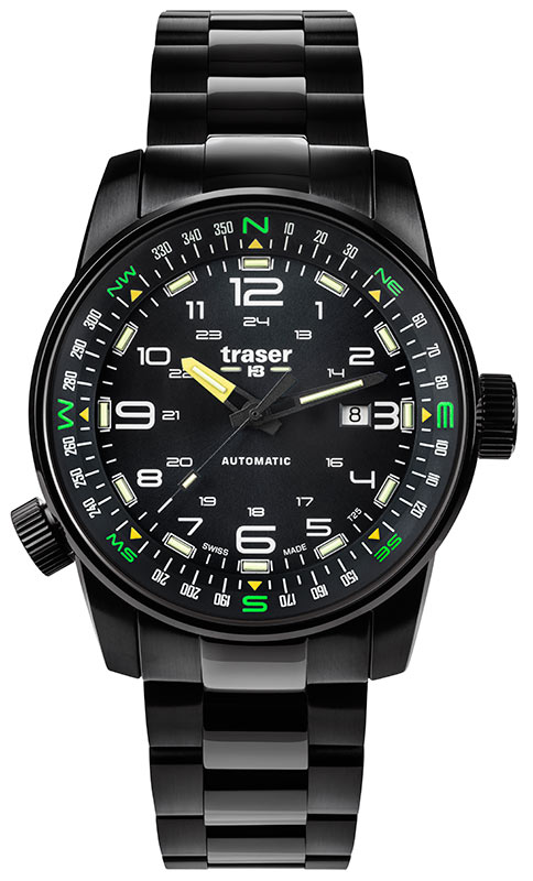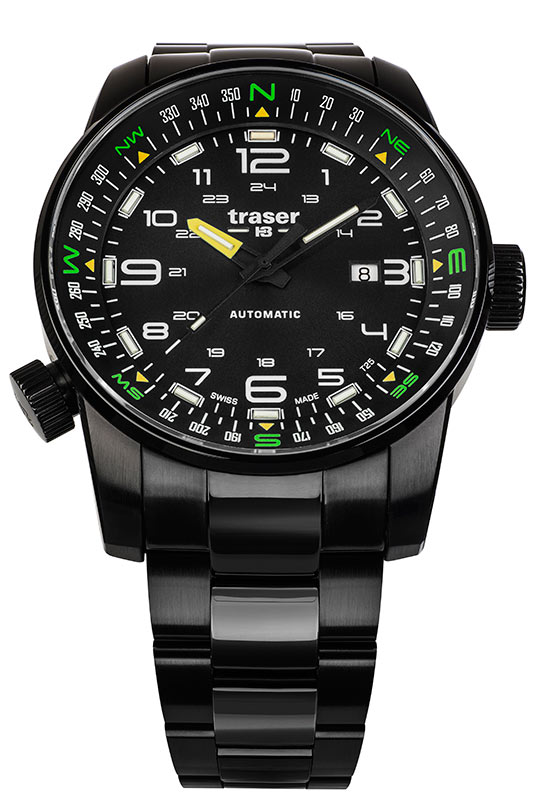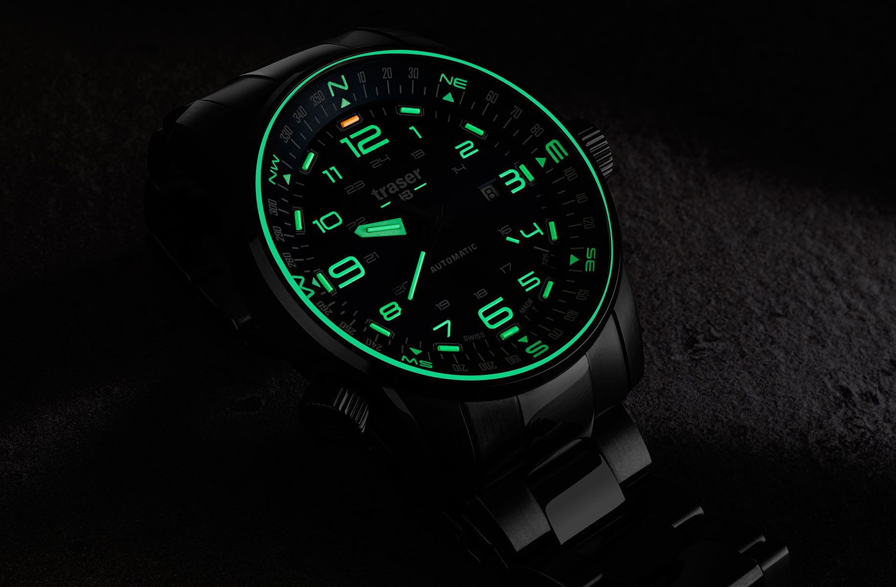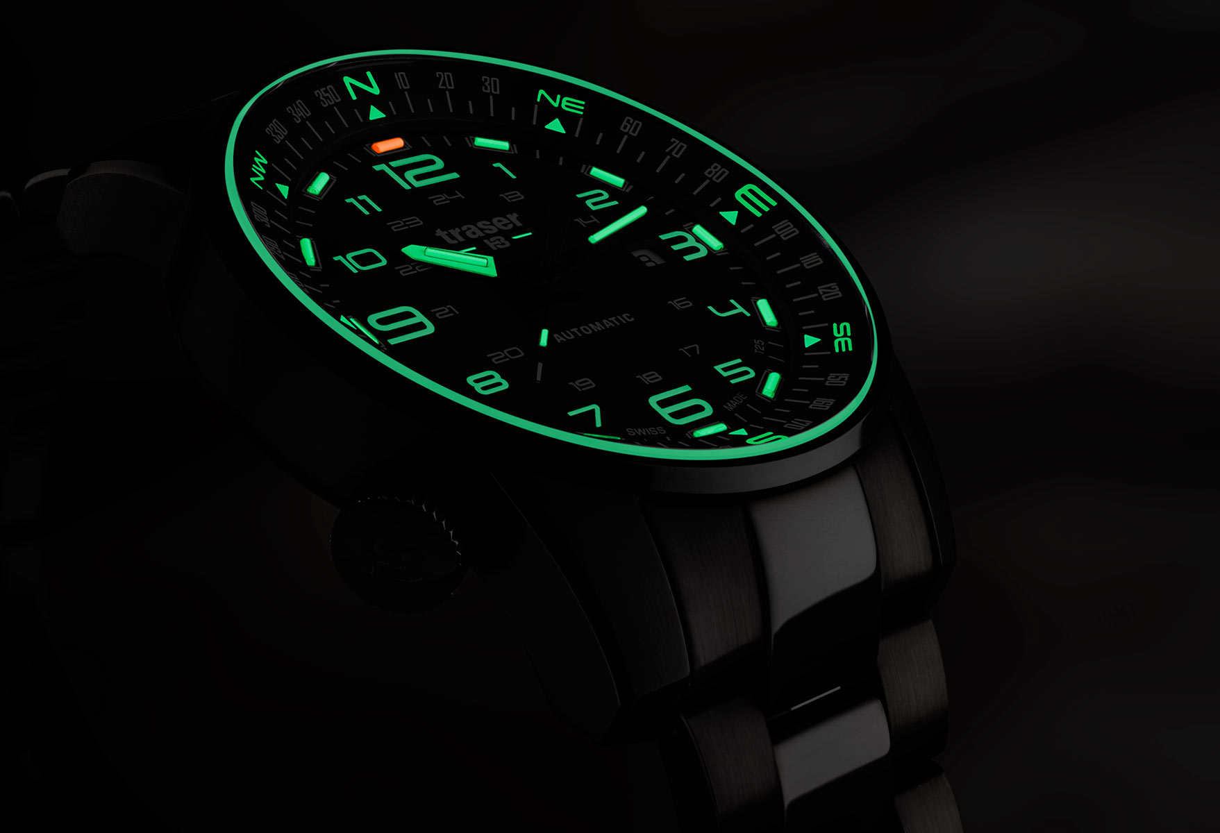 W zakres specyfikacji obecnej na cyferblacie wchodzą: 24-godzinna podziałka czasu, datownik, a dodatkowo — obrotowa skala kompasu regulowana zakręcaną koronką na godzinie ósmej. Wspomniana skala kierunków poświadcza o szlachetnym powołaniu zegarka, nadając mu wielkiego dla człowieka znaczenia. Wskaże mu bowiem nie tylko czas, ale i zadba o odpowiednią drogę, stając się integralnym kompanem dalekich wypraw w nieznane. Dodatkowo tradycyjnie dla marki traser®, zegarek wyposażony jest w 13 jasnozielonych rurek trytu i 1 pomarańczową na tarczy oraz w 3 jasnozielone na wskazówkach. We wnętrzu rurek zastosowana została najbardziej zaawansowana, a do tego samowystarczalna, technologia trigalight®. To najbardziej nowoczesne, samowystarczalne źródło światła, jakie dotąd było stosowane w zegarmistrzostwie, autorskiej produkcji manufaktury mb-microtec - właściciela marki traser®. Największymi i bezkonkurencyjnymi jego atutami są: brak potrzeby zewnętrznych źródeł energii, by móc emitować światło, 10 lat gwarancji świecenia z tym samym natężeniem, zapewnienie żywotności gazowych rurek przez nawet 25 lat! Do tego są one bezobsługowe i w pełni bezpieczne!