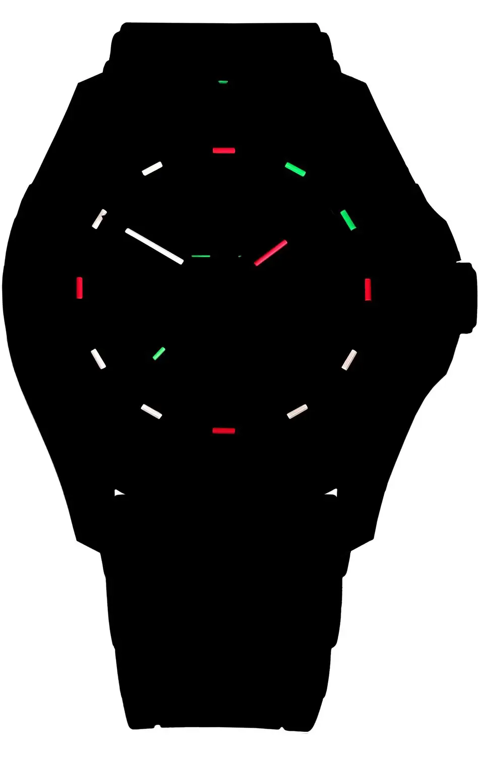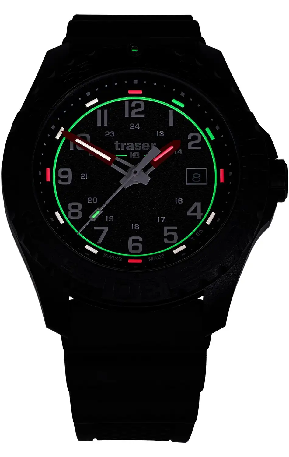 Osobny rozdział w tym modelu należy się podświetleniu, bo właśnie ono definiuje serię OdP Color. Traser zastosował tutaj technologię spectralight®, będącą rozwinięciem znanego trigalight®, opartą na samowystarczalnej luminescencji bez potrzeby ładowania światłem czy zużywania baterii. Kolorowe tuby H3 na wskazówkach i indeksach świecą nieprzerwanie, oferując wysoką intensywność i natychmiastową czytelność zarówno w dzień, jak i w całkowitej ciemności. Dodatkowo zegarek wyposażono w luminescencyjną uszczelkę, która wzmacnia orientację na tarczy nocą i pozwala odczytać czas jednym spojrzeniem, nawet w warunkach ograniczonej widoczności.