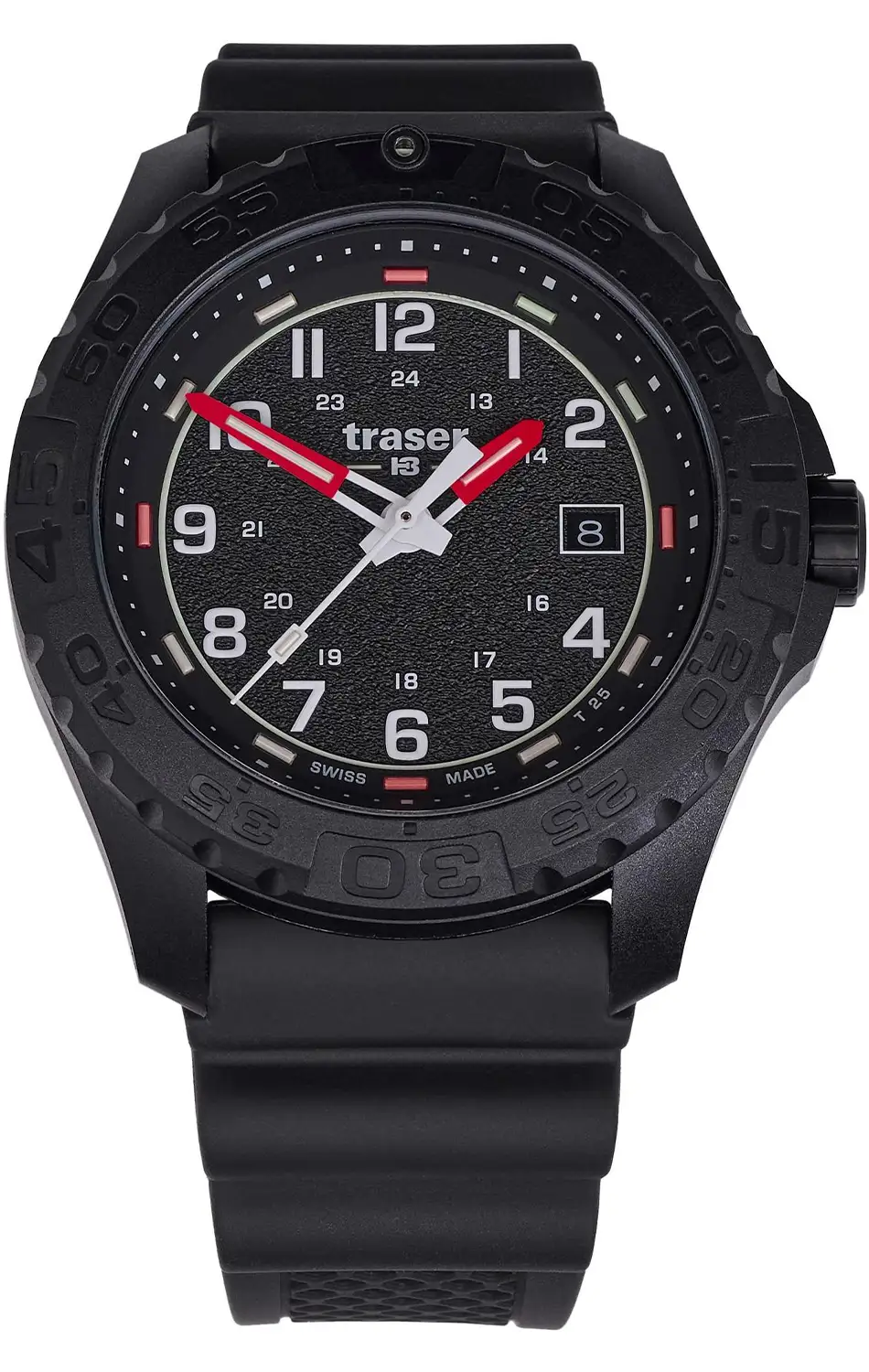 Czytelność taktycznego czasomierza traser P96 nie jest dziełem przypadku. Chropowata tekstura tarczy ogranicza odbicia światła, matowa czarna koperta eliminuje refleksy, a wyraźne arabskie cyfry, kontrastowe indeksy i szkieletowe wskazówki tworzą klarowny, logiczny układ. Podwójna skala 12 i 24 godziny podkreśla militarny rodowód modelu i ułatwia orientację w czasie podczas działań terenowych. To zegarek, który nie próbuje imponować formą, lecz konsekwentnie spełnia swoją funkcję. Jeśli szukasz narzędzia, które działa zawsze tak samo pewnie, Traser P96 OdP Color Black po prostu robi swoją robotę i właśnie dlatego trafia na właściwy nadgarstek.
