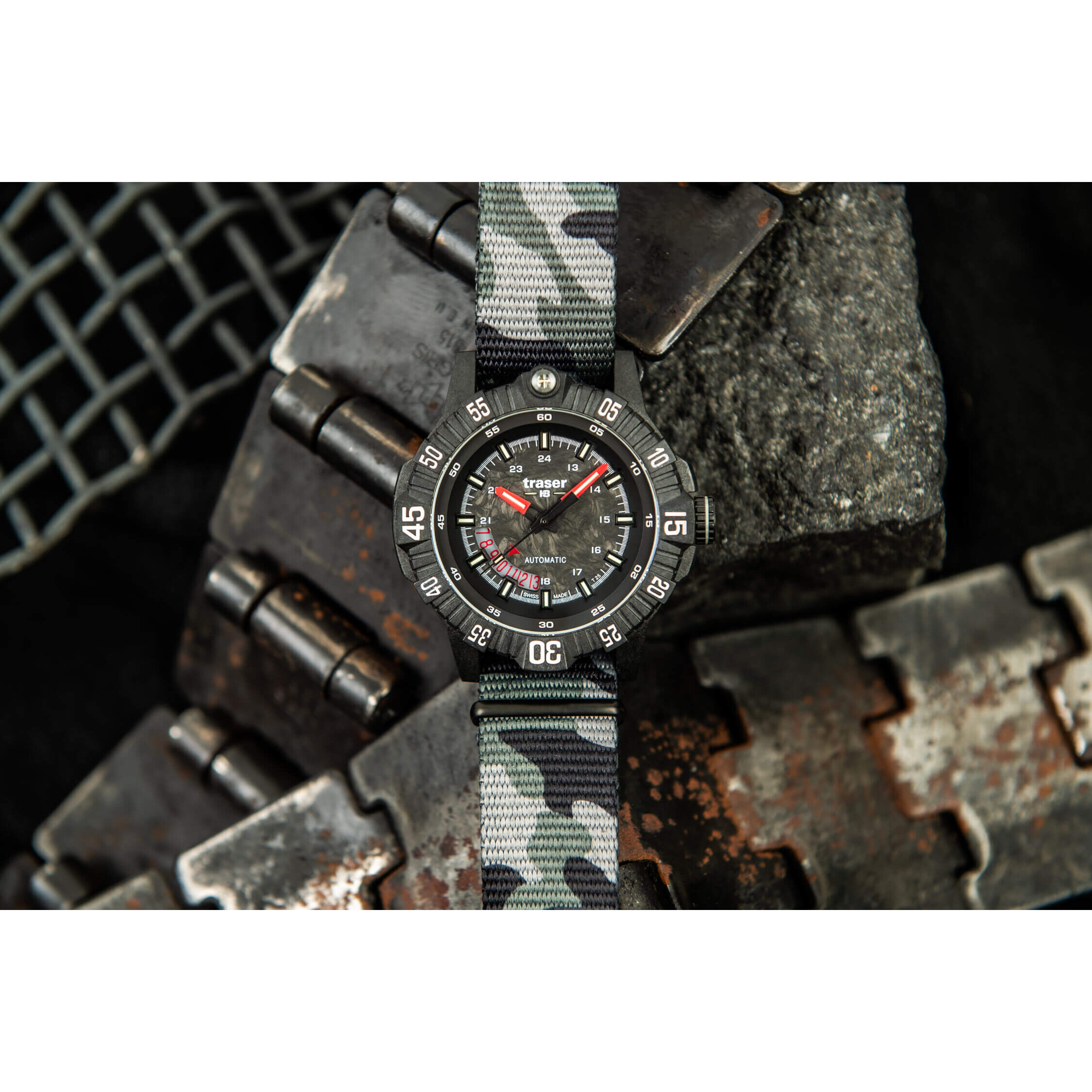 Taktyczny zegarek traser 110960 wyróżnia się czarną, wielowarstwową tarczą wykonaną z karbonu, której struktura nadaje głębi i niepowtarzalnego stylu. To, co jednak naprawdę przyciąga wzrok, to wyjątkowy blask technologii trigalight® – rurki gazowe zapewniają subtelne, długotrwałe podświetlenie, które sprawia, że odczyt czasu jest możliwy nawet w całkowitej ciemności. Dodatkowo, indeksy 15, 30 i 45 na wytrzymałym, carbonowym bezelu są pokryte warstwą Super-LumiNova®, która wzmaga ich widoczność i dodaje zegarkowi nowoczesnego charakteru. Nawet uszczelka wokół szafirowego szkła jest podświetlana, tworząc efekt, który nie tylko poprawia funkcjonalność, ale też dodaje nuty futurystycznego stylu. Praktyczny datownik, umieszczony przy godzinie ósmej, został zaprojektowany z myślą o wygodzie – pozwala na szybki i intuicyjny odczyt aktualnego dnia miesiąca. Męski zegarek traser P99 A Tactical to perfekcyjna harmonia estetyki, innowacji i funkcjonalności, zaprojektowana z myślą o osobach poszukujących zegarka, który sprosta każdemu wyzwaniu.